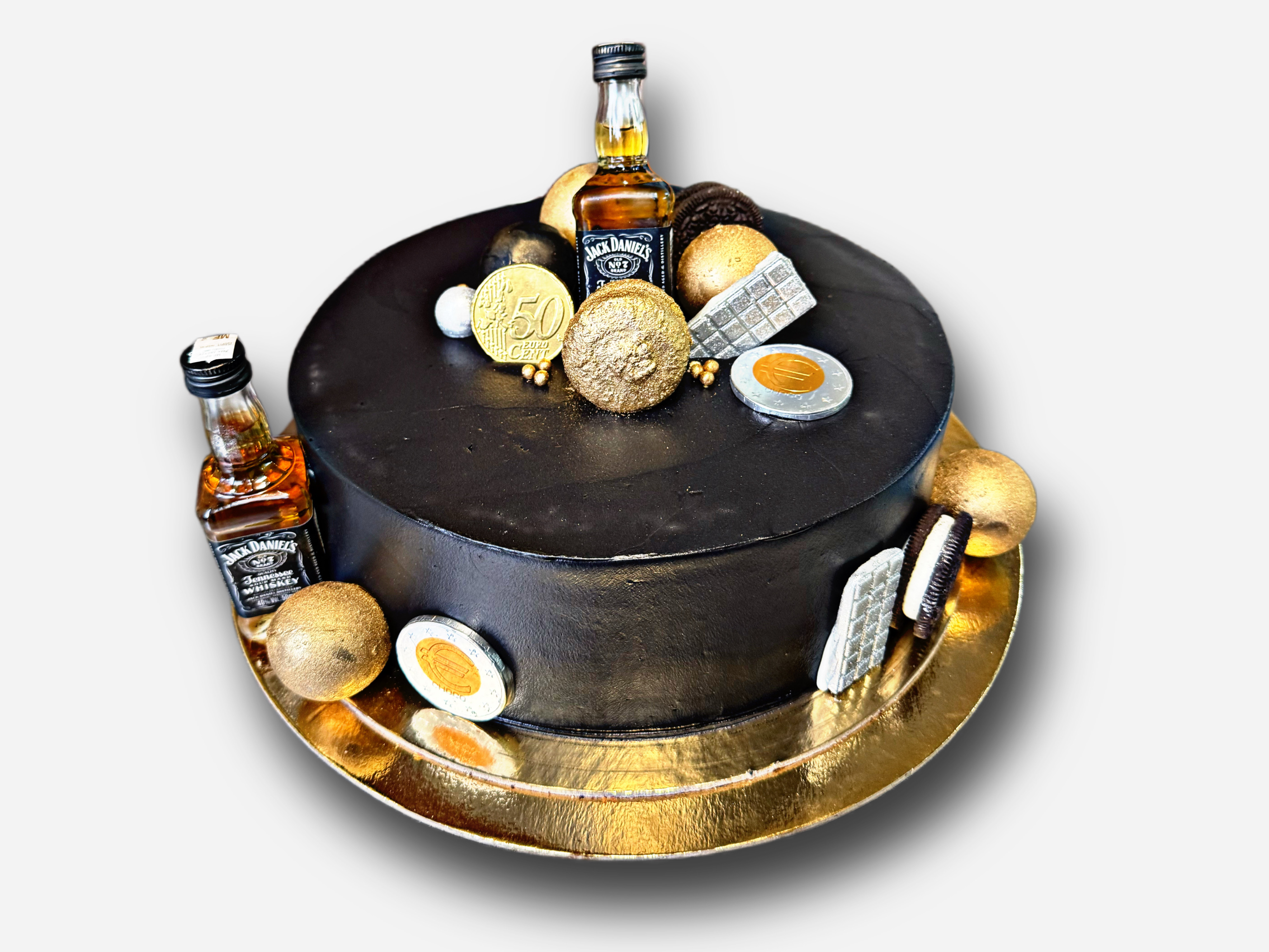 Elegancki tort w nowoczesnym, męskim stylu. Pokryty idealnie gładkim, matowym tynkiem w kolorze głębokiej czerni. Dekoracje utrzymane są w kolorystyce czerni, złota i srebra, co nadaje całości luksusowego charakteru. Górę tortu zdobi miniaturowa butelka whisky w otoczeniu złotych kul, czekoladowych monet oraz dekoracyjnych elementów przypominających sztabki złota i srebra. Dodatkowo akcenty w postaci buteleczek alkoholu i monet rozmieszczone są również przy podstawie tortu, tworząc spójną, efektowną kompozycję. Tort idealnie sprawdzi się na urodziny, jubileusz lub inne wyjątkowe okazje dla miłośników eleganckiego stylu i mocnych, wyrazistych dekoracji.