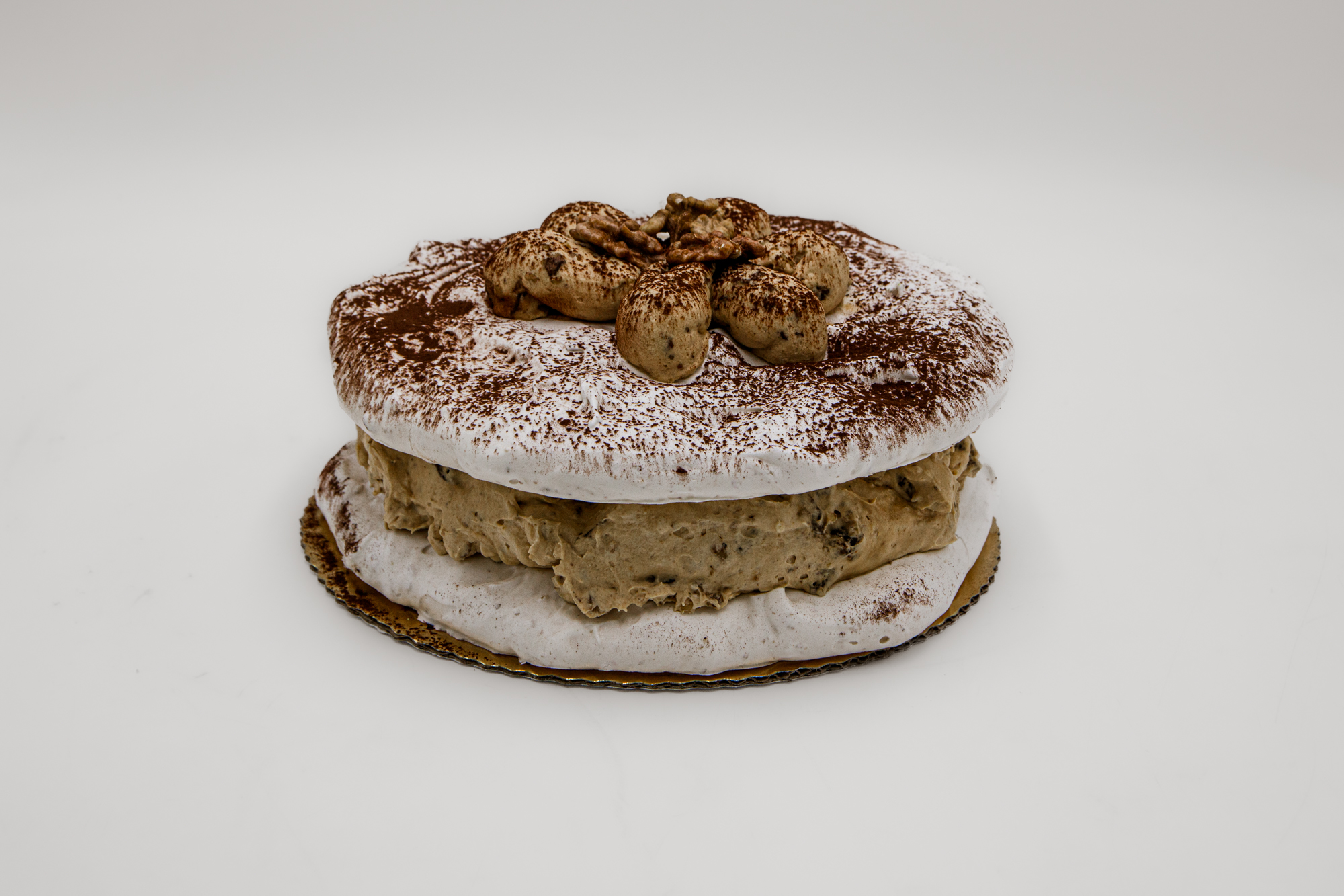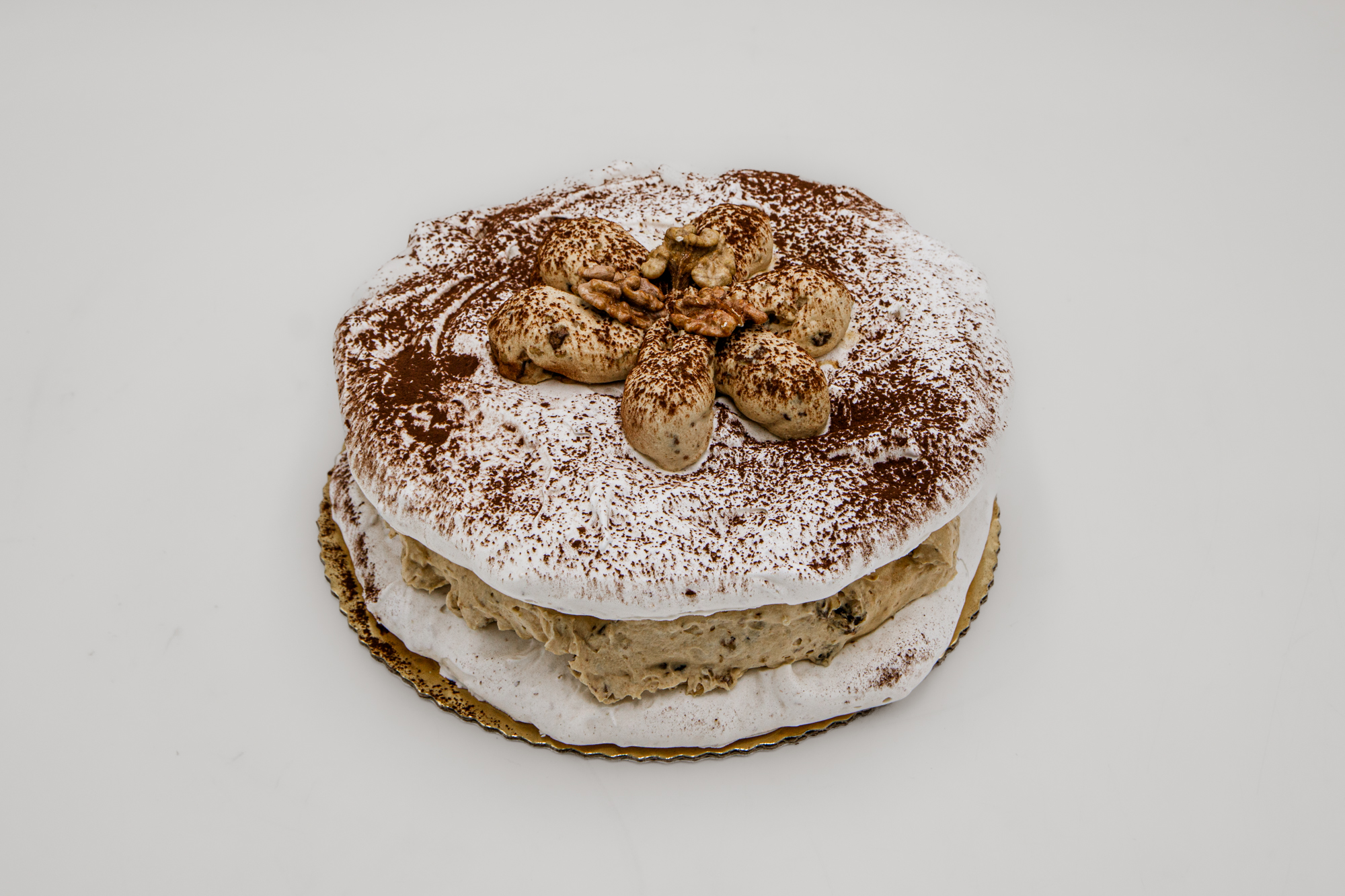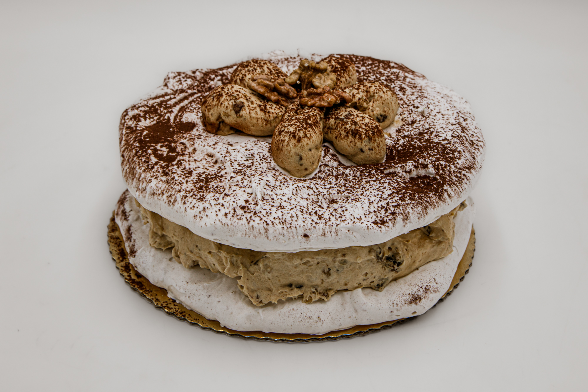 Wyszukane smaki orientu z nutą kawy, zamknięte w dwóch bezowych warstwach, przełożone karmelowym kremem na bazie bitej śmietany z dodatkiem daktyli i orzechów włoskich.
