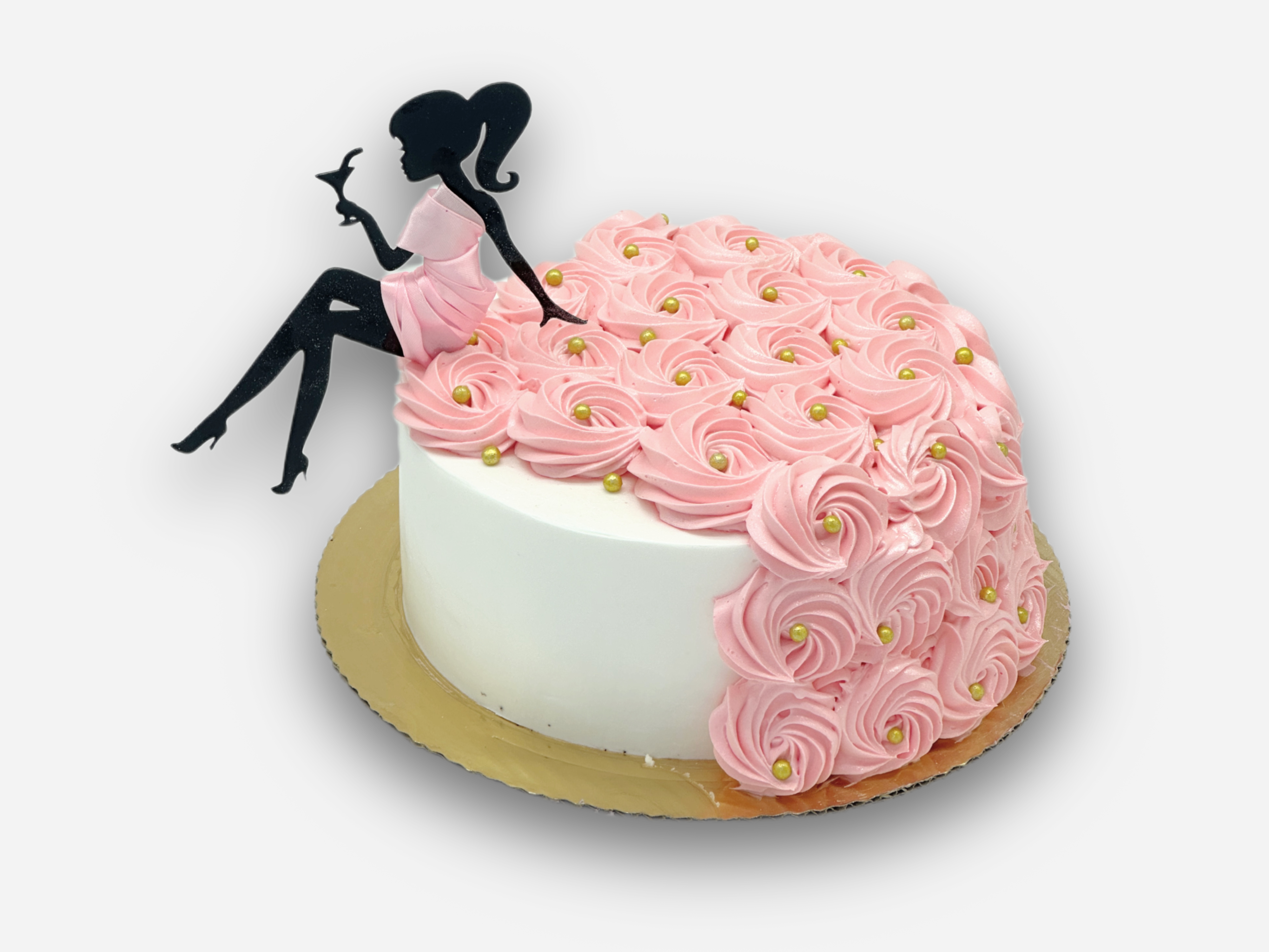 Wyjątkowy tort dla wyjątkowej wybranki a może na wieczór panieński. Tort dekorowany bitą śmietaną w kolorze różu z topperem w kształcie siedzącej kobiety.