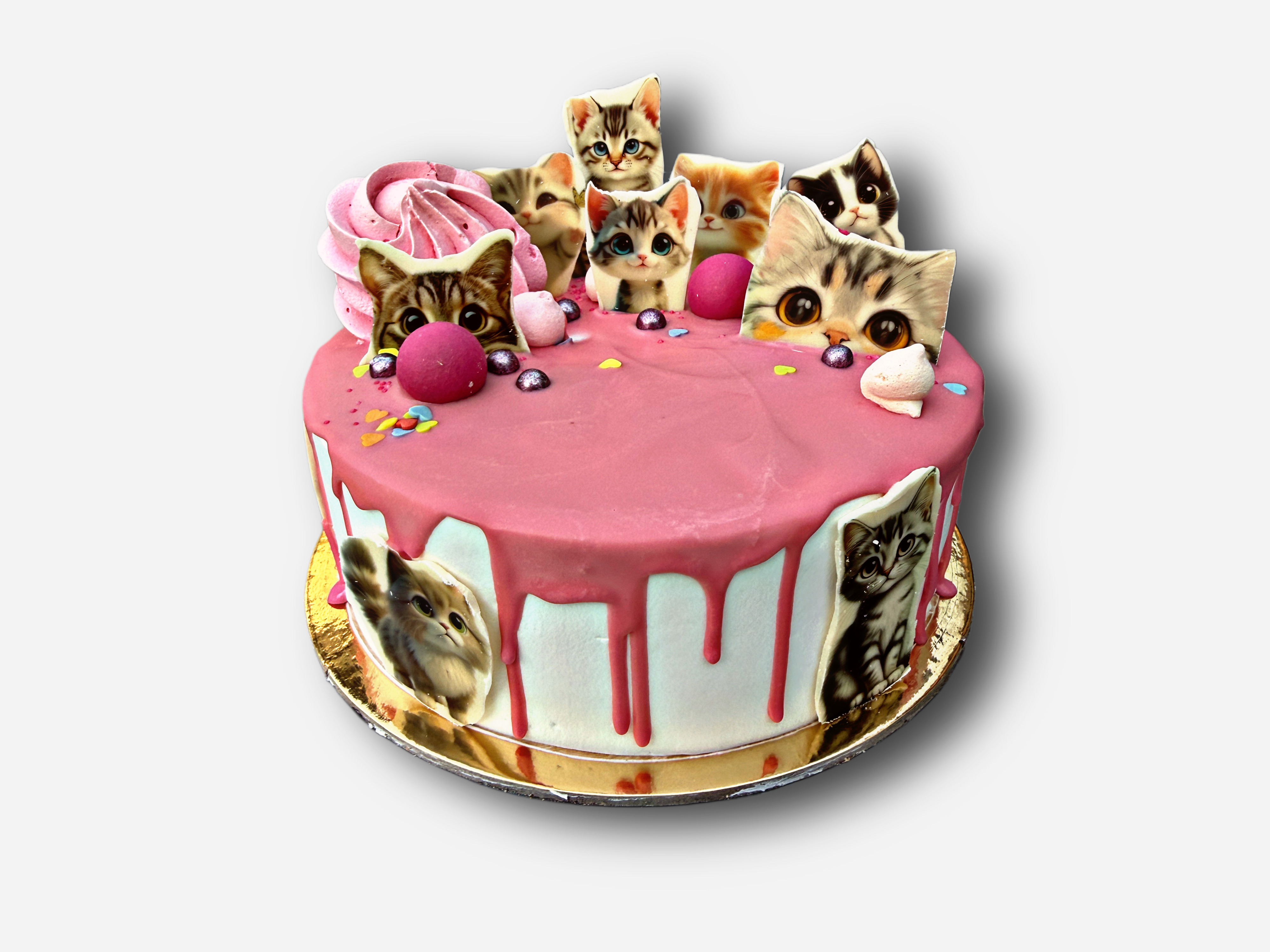 Uroczy tort w kocim stylu, który zachwyca od pierwszego spojrzenia! Idealny wybór na urodziny miłośnika kotów, przyjęcia dziecięce lub każdą okazję, która wymaga słodkiej dawki uroku!