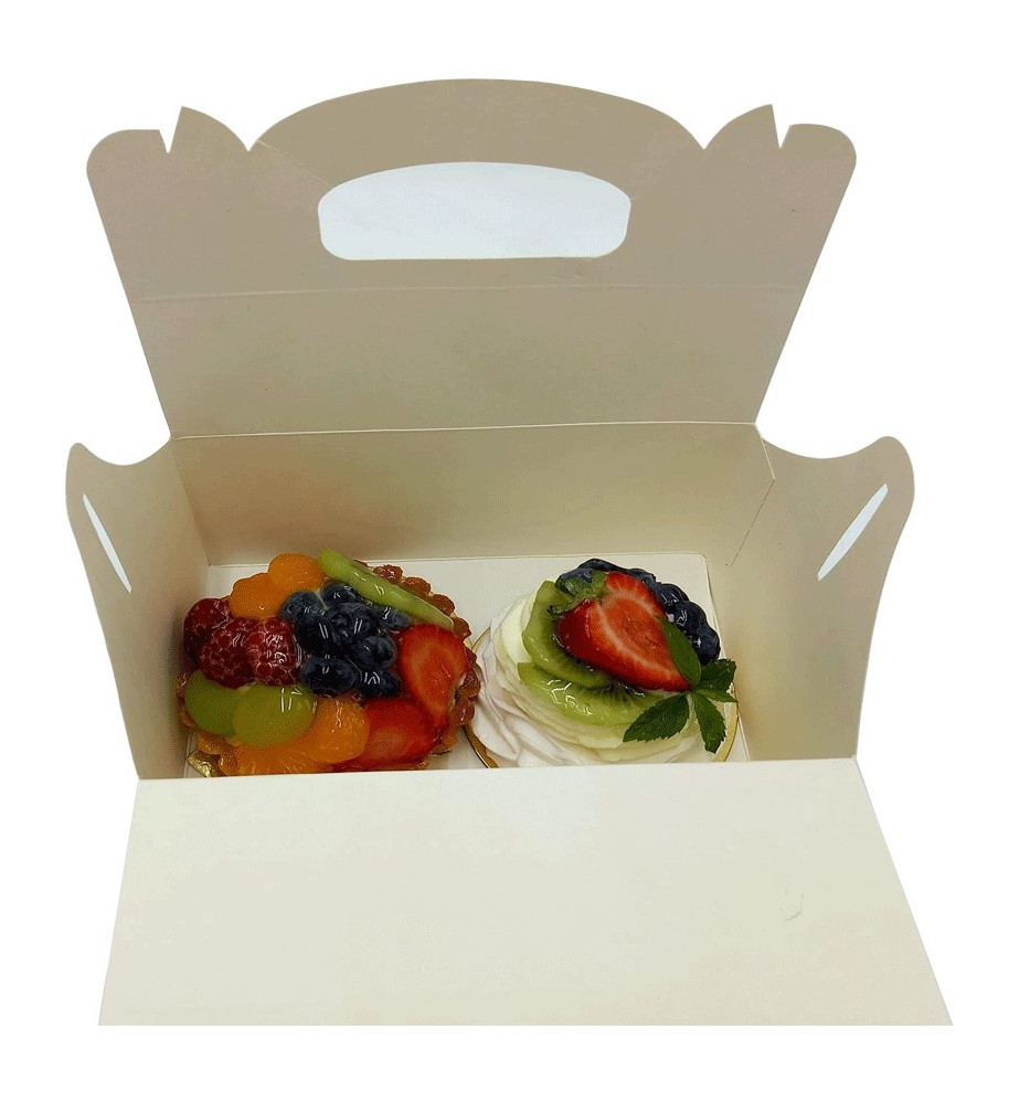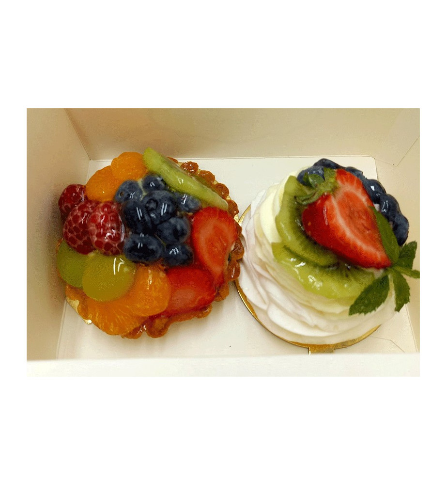 W pudełeczku znajduje się mini beza i tartaletka z owocami.