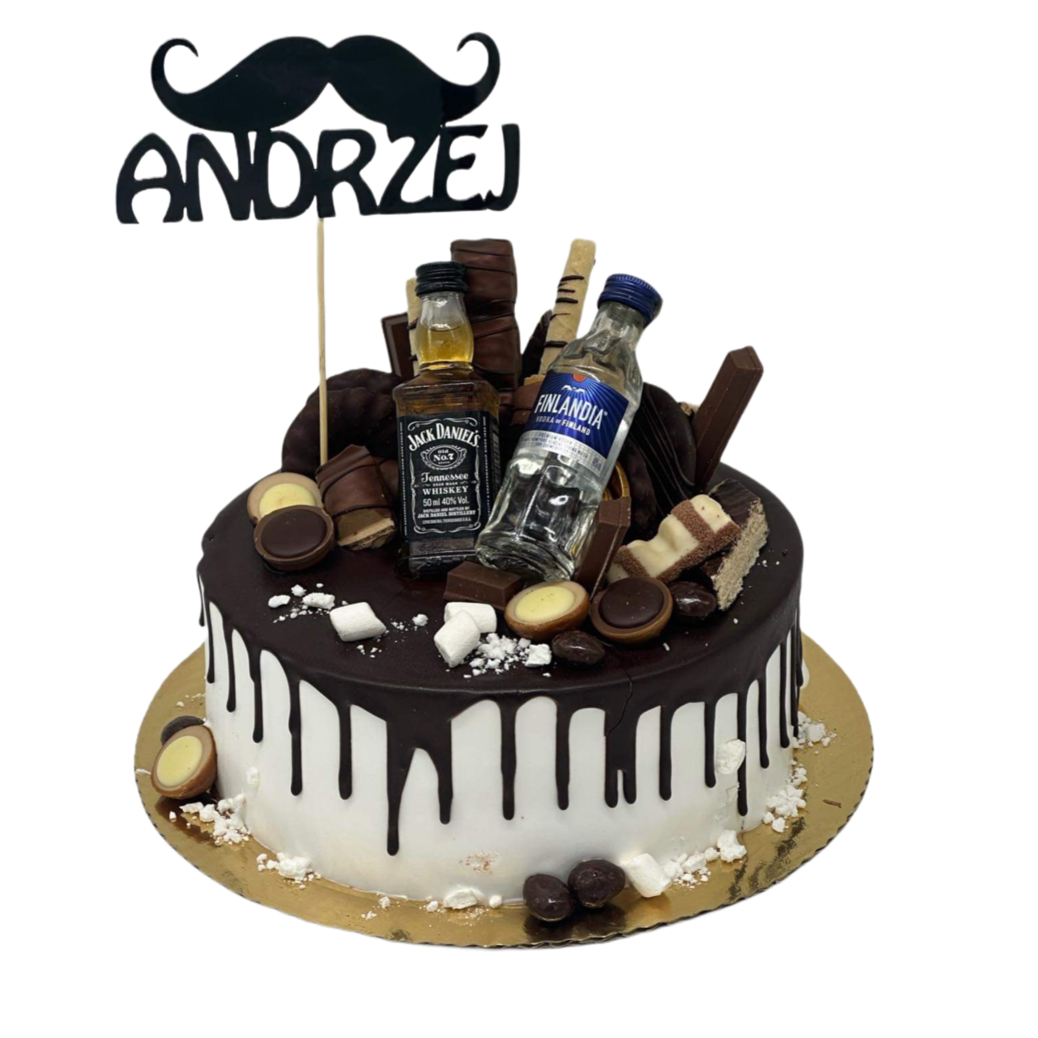 Tort Drip cake z buteleczkami i topperem to idealny prezent dla Andrzezja. Dekorowany czekoladkami oraz dwiema buteleczkami alkoholu. Po bokach spłwająca czekolada. Tort jest dostępny wielu wariantach smakowych.