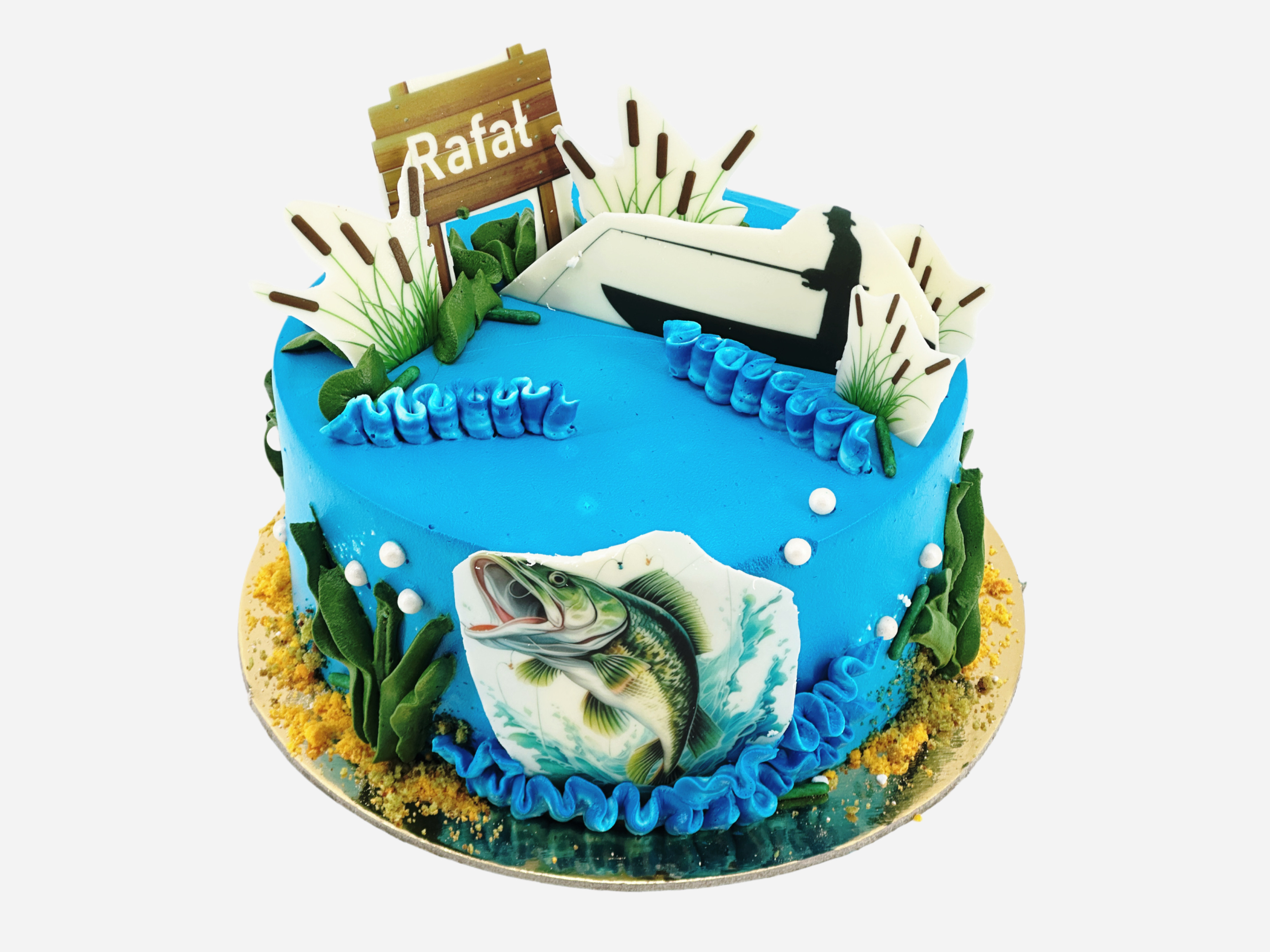 Tort dla pasjonata wędkarstwa. Figurki wydrukowane na białej czekoladzie.