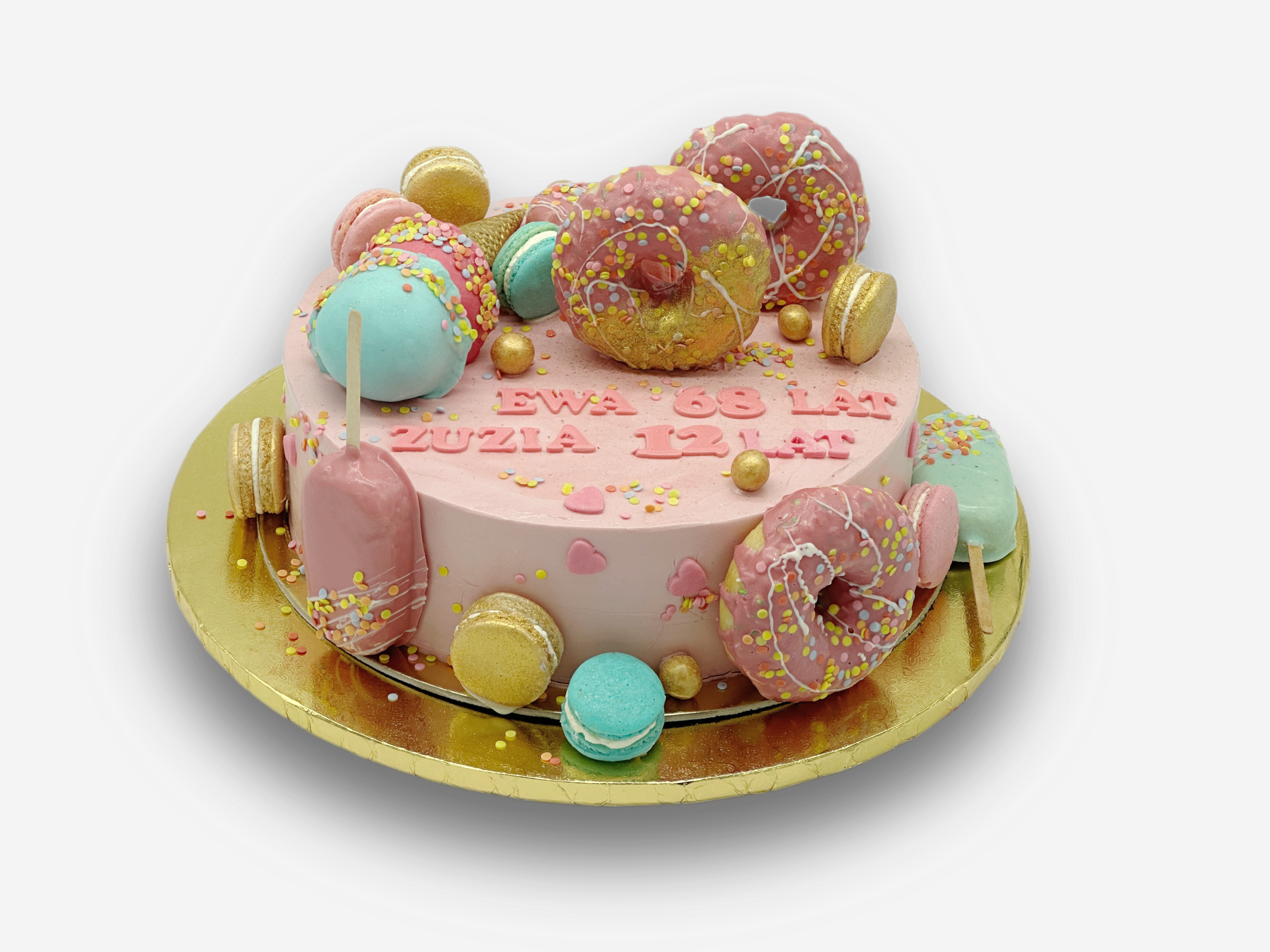 Tort utrzymany jest w kolorystyce różowej zdobią go rozmaite słodkośći, obsypany kolorową posypką.