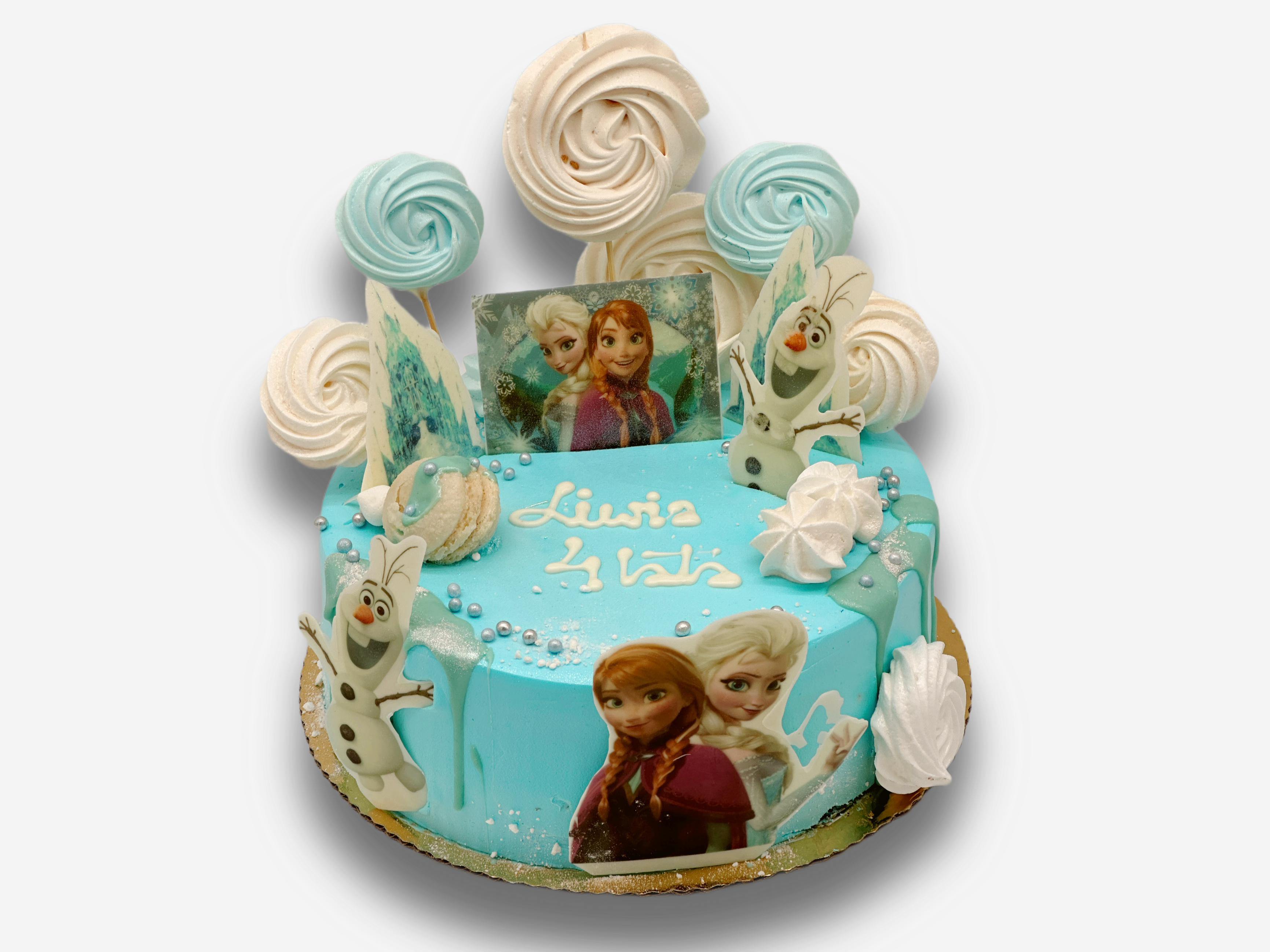 Tort dekorowany figurkami Elzy i Anny. Figurki wydrukowane na białej czekoladzie.