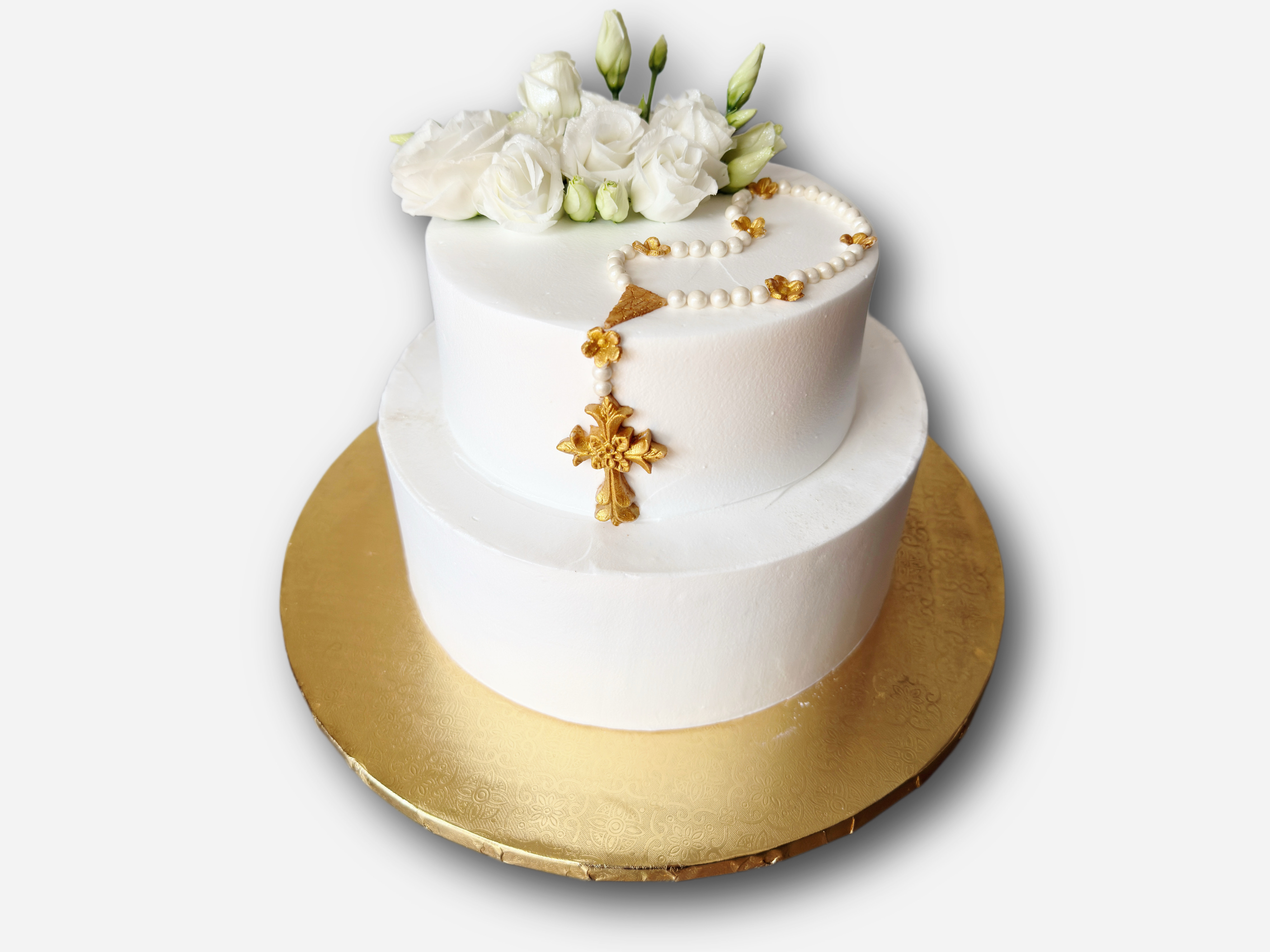Ten wyjątkowy tort komunijny zachwyca swoją klasyczną formą i subtelną delikatnością. Górna warstwa ozdobiona została efektownym różańcem z perełek zakończonym złotym krzyżem, który delikatnie spływa na dolne piętro tortu. Kompozycje wieńczą świeże białe kwiaty - eustomy które dodają całości lekkości i świeżości.