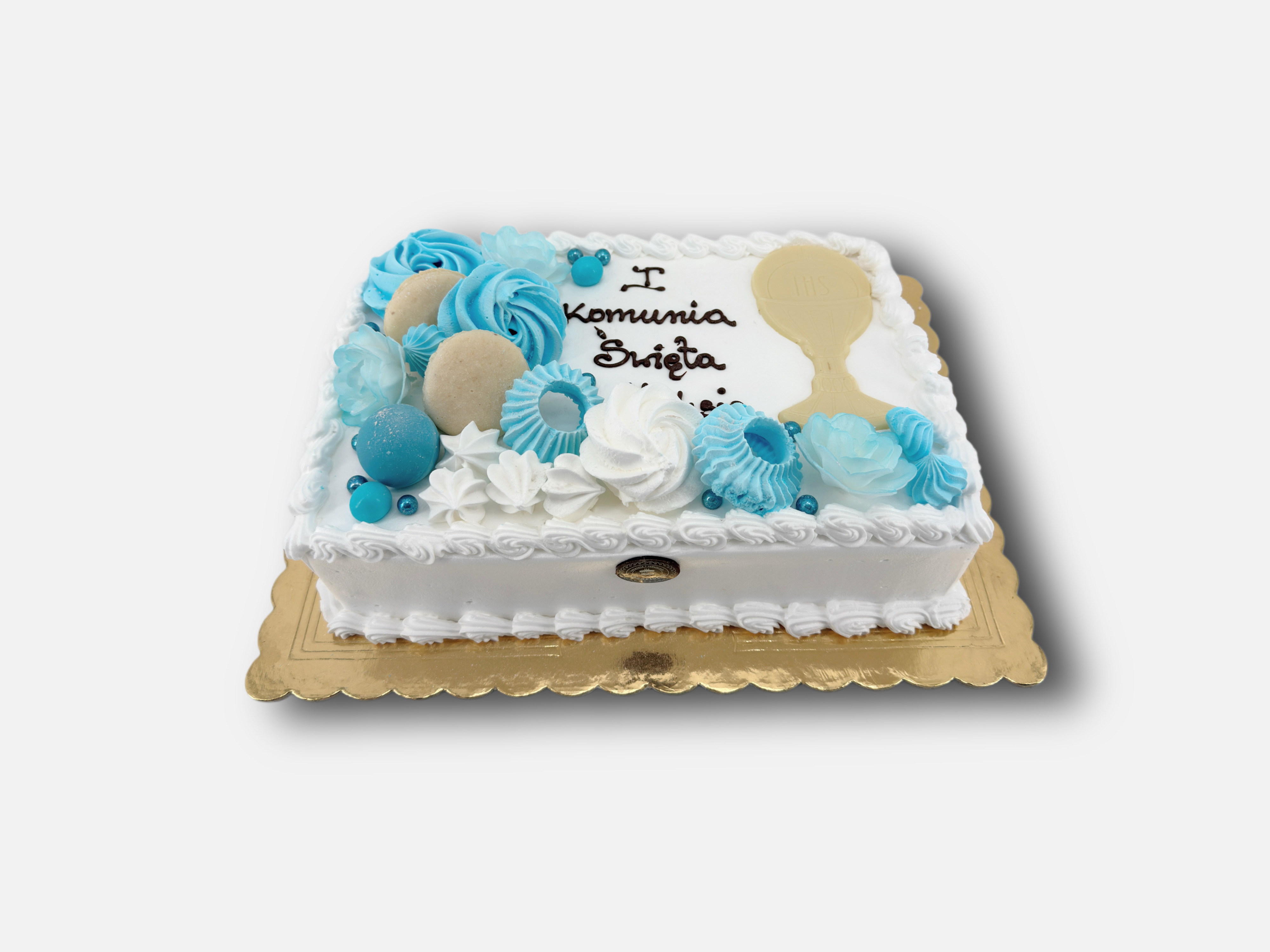 To klasyczny, prostokątny tort komunijny, ozdobiony w odcieniach bieli i błękitu. Tort utrzymany jest w eleganckiej i skromnej kolorystyce, dzięki czemu idealnie nadaje się na przyjęcie z okazji Pierwszej Komunii Świętej, szczególnie dla chłopca.