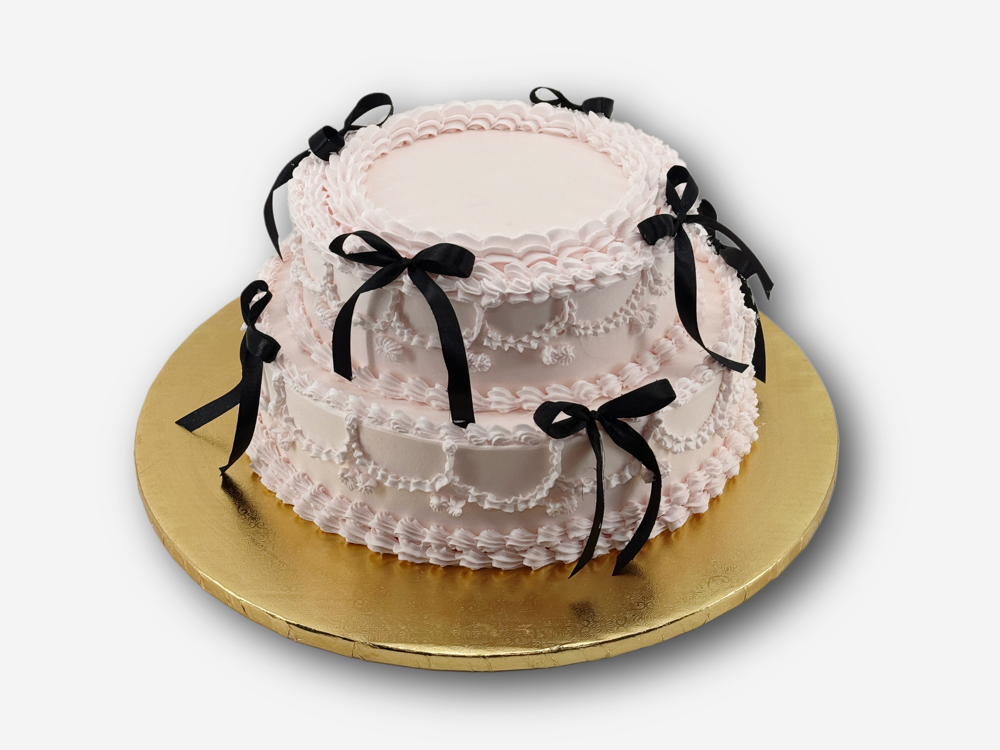 Ten tort ma bardzo elegancki i klasyczny wygląd - jego zewnętrzna dekoracja to delikatne koronki z różowej śmietanki, a całość dopełniają czarne kokardki.
