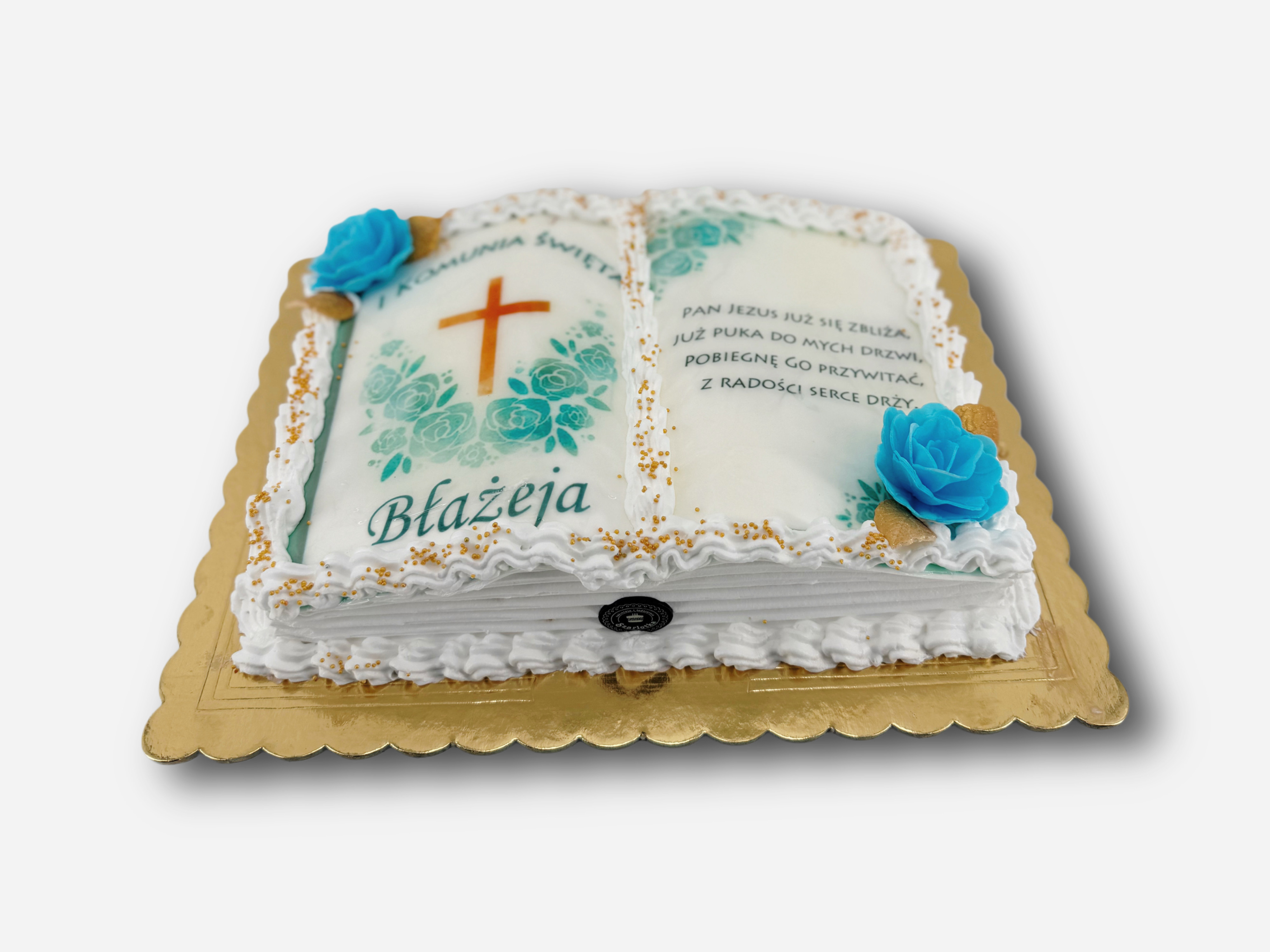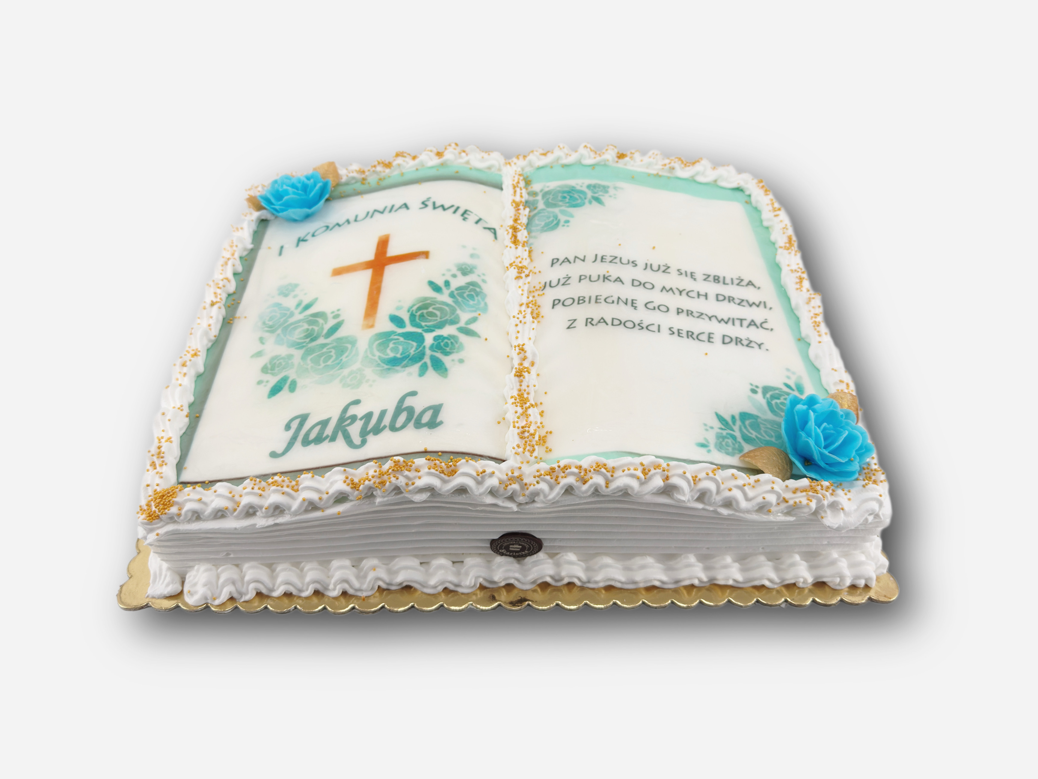 Tort w kształcie książki z grafiką o tematyce komunijnej. Tort ze śmietany z warstwą frużeliny owocowej.
