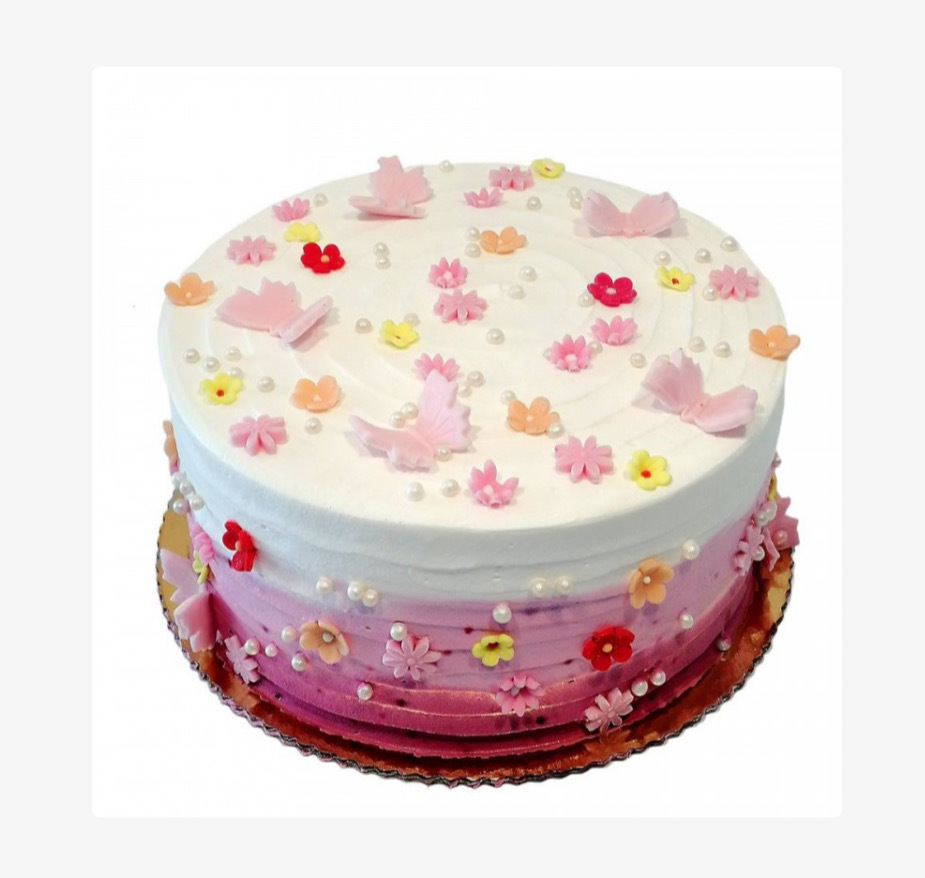 Tort dekorowany kolorowymi kwiatkami i motylkami.