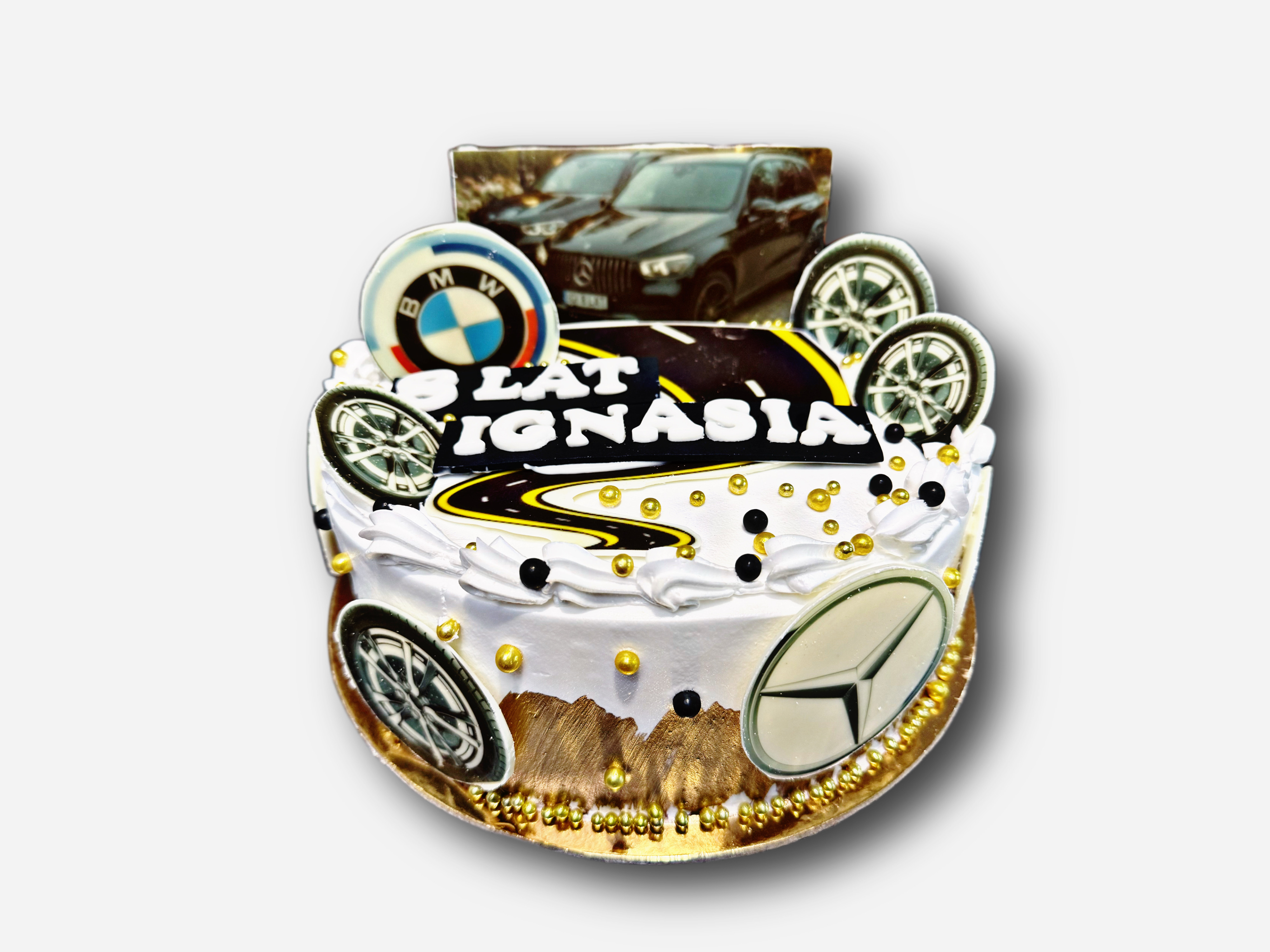Efektowny tort inspirowany światem motoryzacji premium- złote detale, sportowe felgi i dynamiczna grafika auta. Idealny dla fana szybkich i luksusowych samochodów.