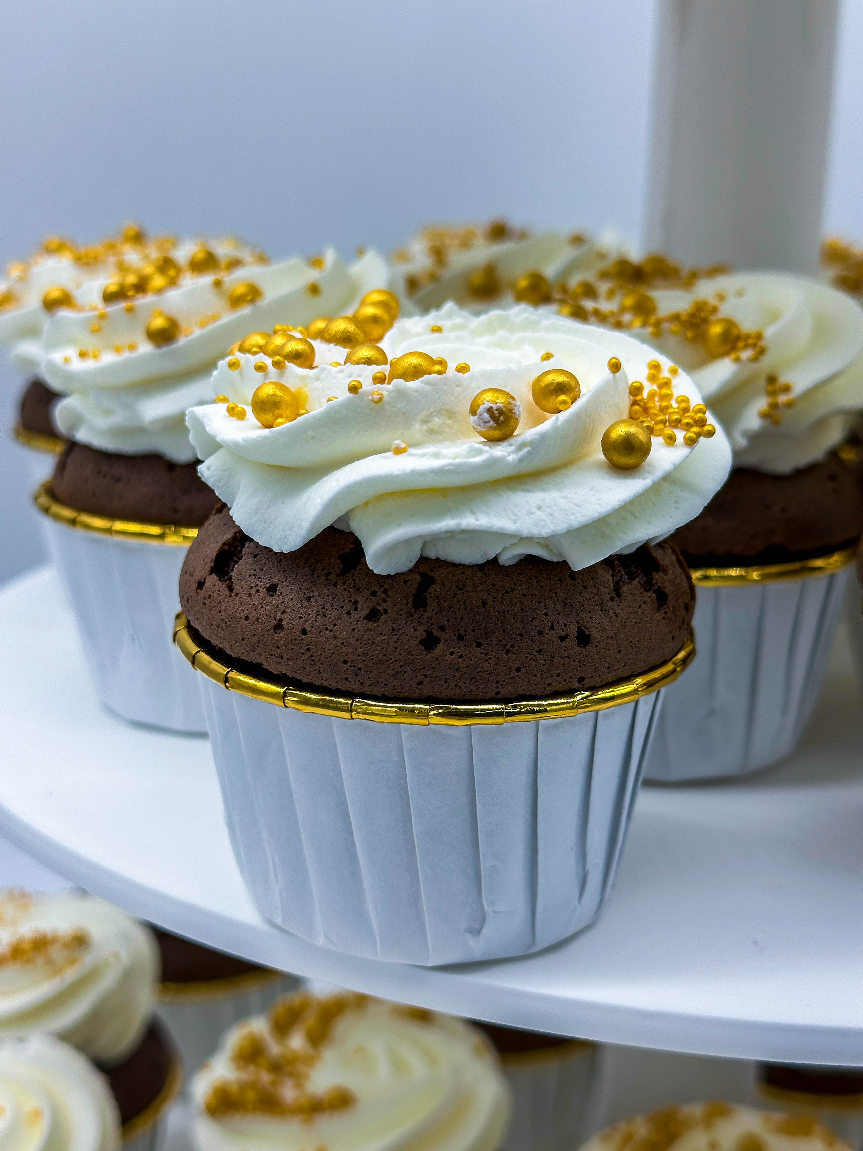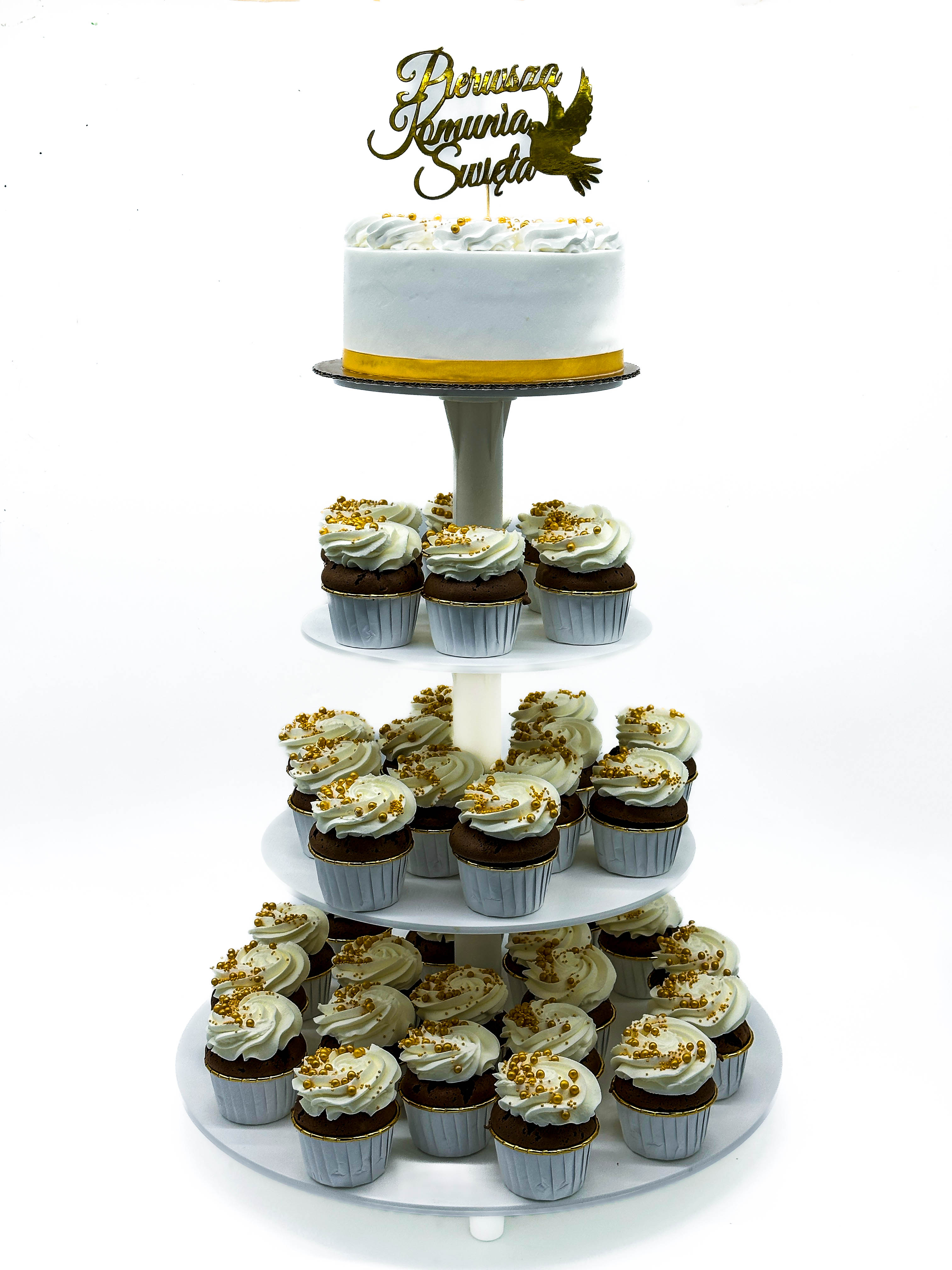 Tego typu zestaw ( tort i babeczki ) coraz częściej zastępuje tradycyjny tort. Tort i muffinki posypane są delikatnie złotymi kuleczkami. Tort przeznaczony maksymalnie do 50 osób.