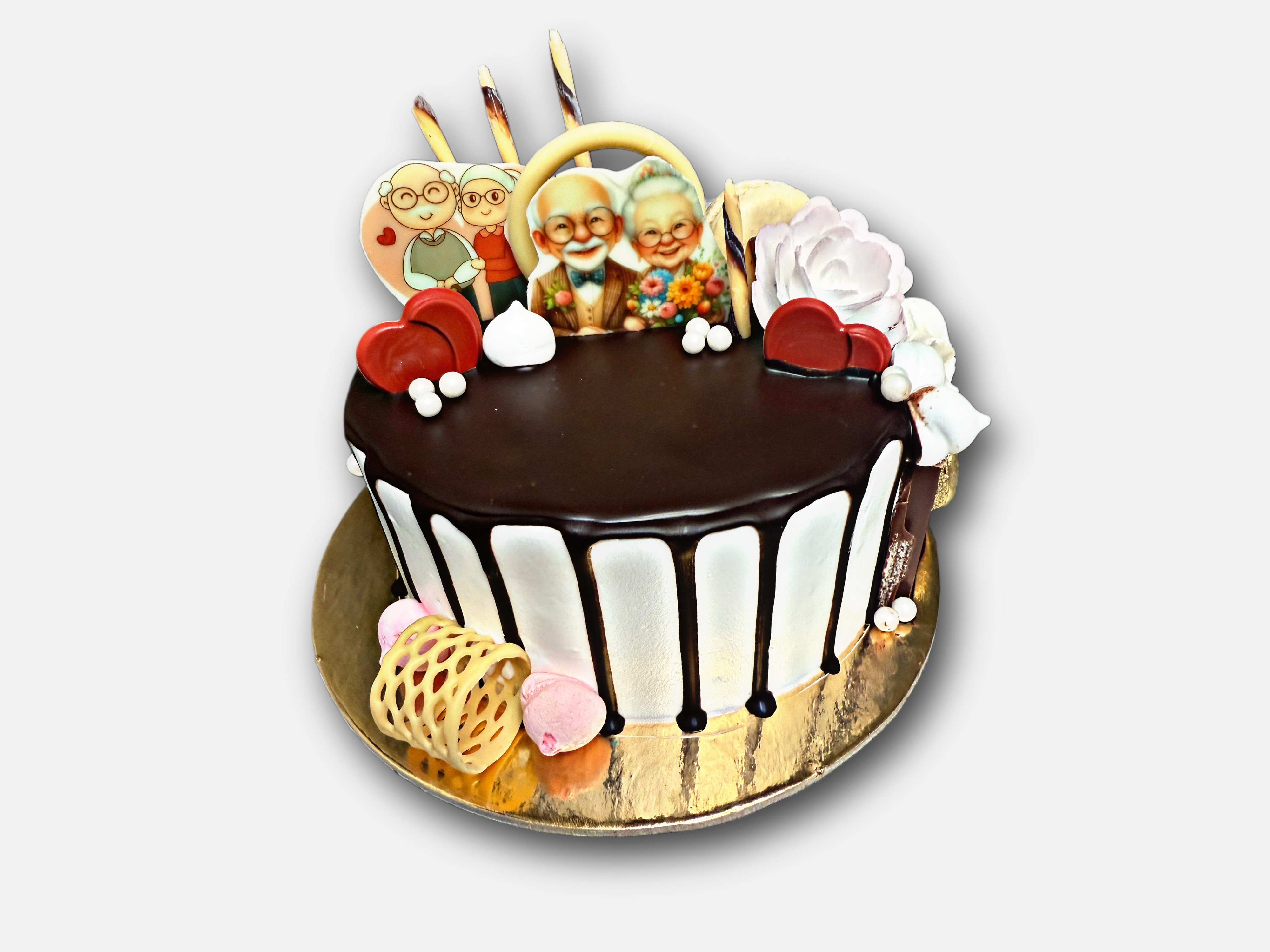Elegancki tort na Dzień Babci i Dziadka z jasnym kremem i efektownym czekoladowym dripem. Wierzch zdobi dekoracja z motywem Babci i Dziadka, czekoladowe serca oraz delikatne elementy z białej czekolady. Całość utrzymana w klasycznym, ciepłym stylu, idealna jako słodki prezent na wspólne rodzinne świętowanie.