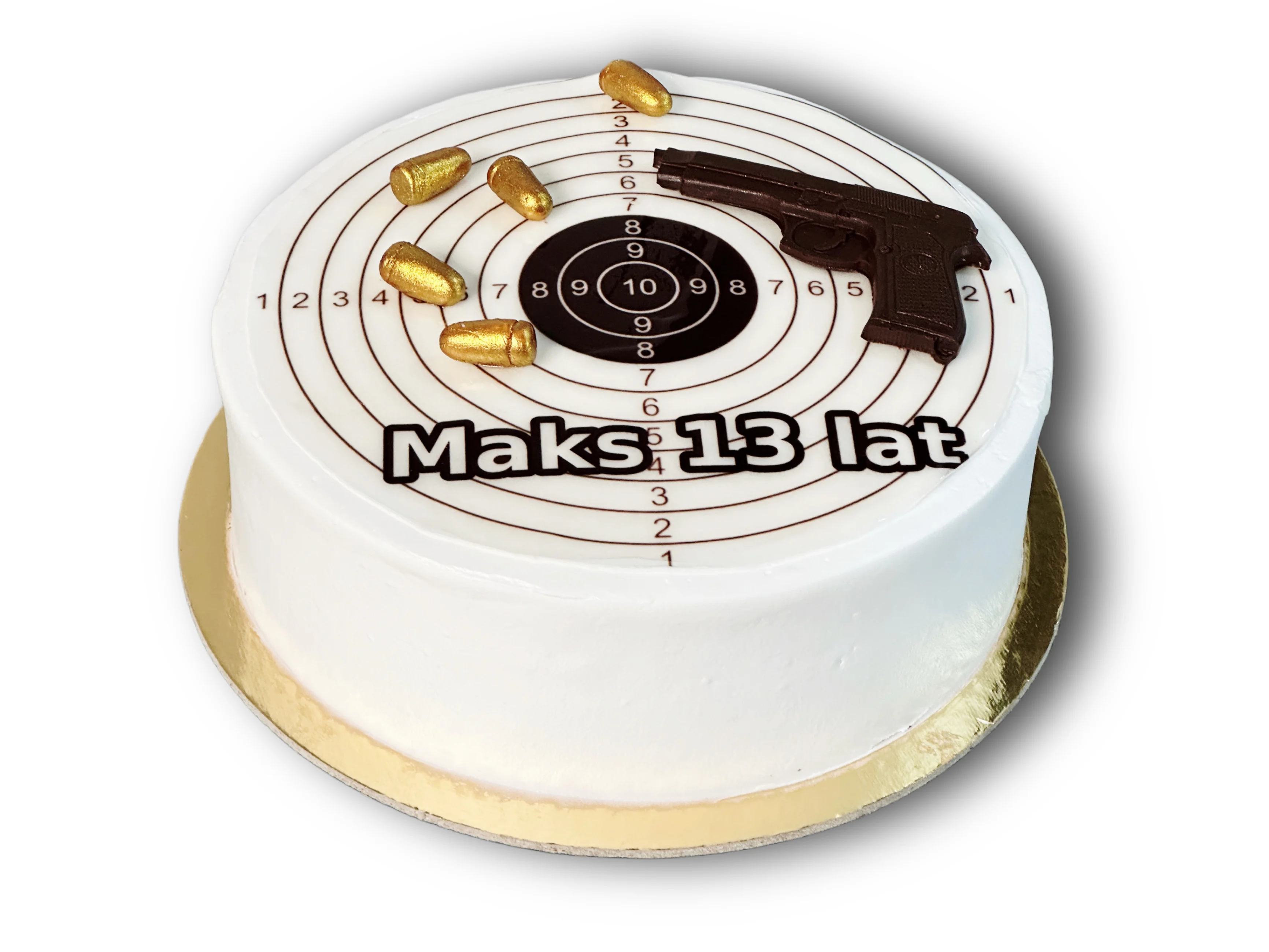 Tort foto z tarczą strzelniczą i czarnym pistoletem.