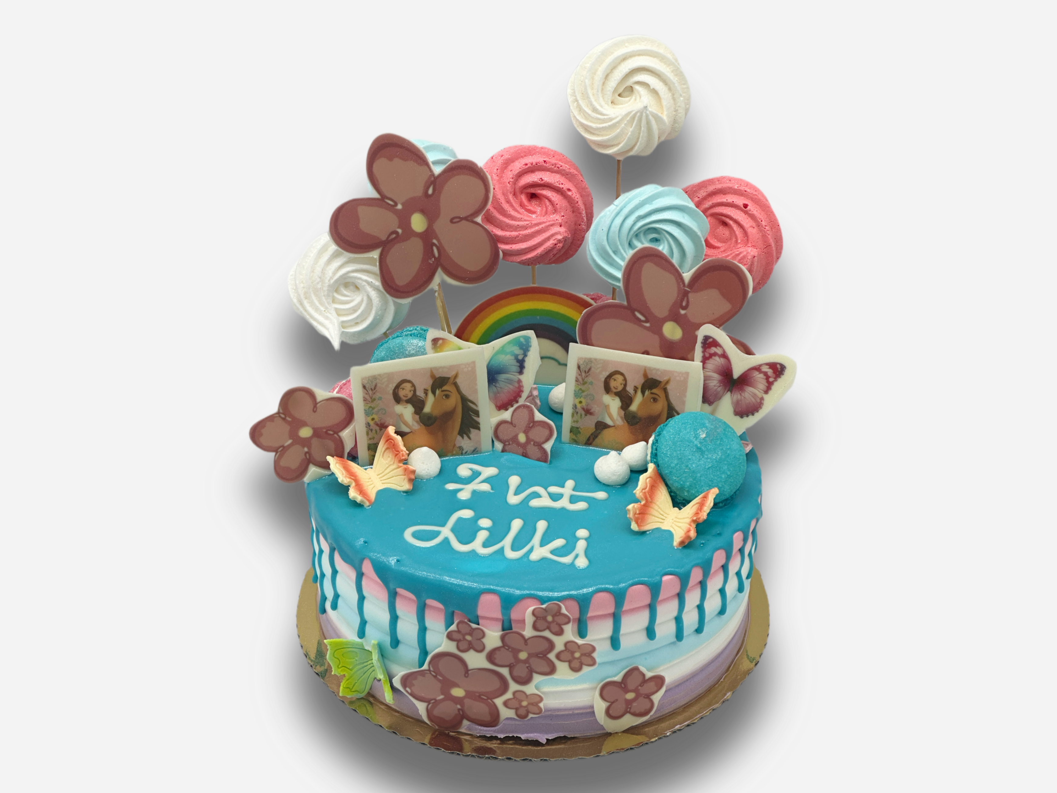 Tort dekorowany figurkami wydrukowanymi na białej czekoladzie. Kolorystyka tortu jest dopasowana do bajkowych bohaterów.