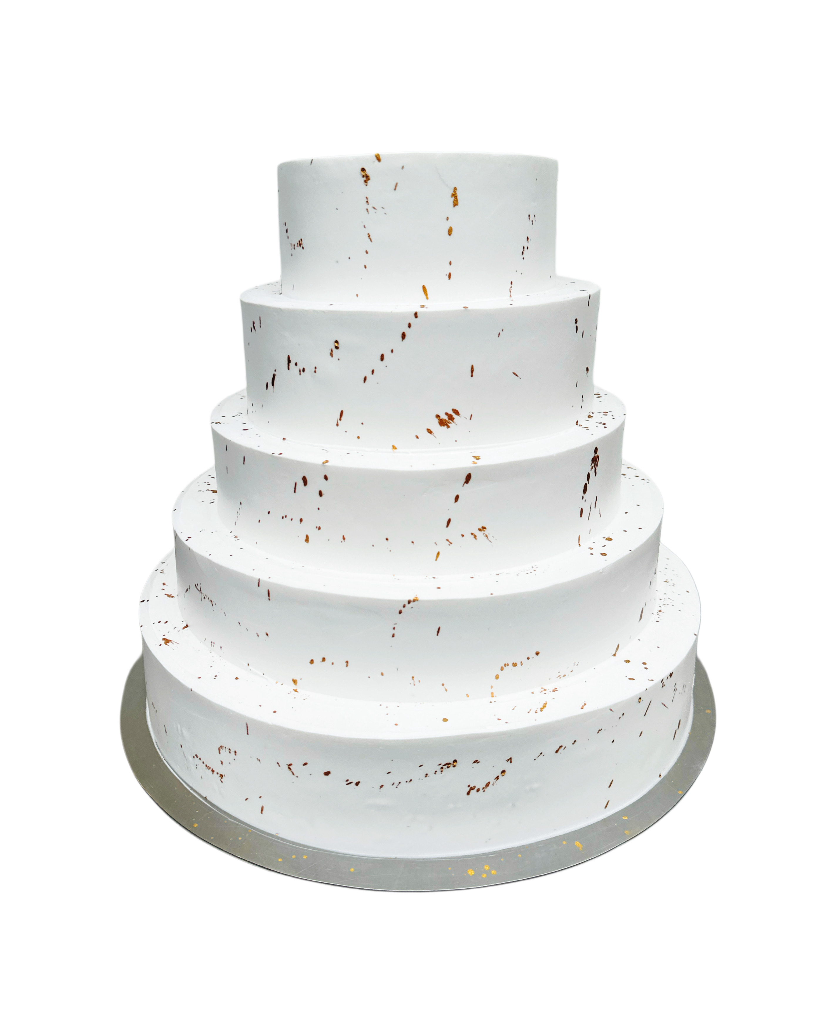 Tort weselny wygładzony na biało a po całości udekorowany złotkiem jadalnym.