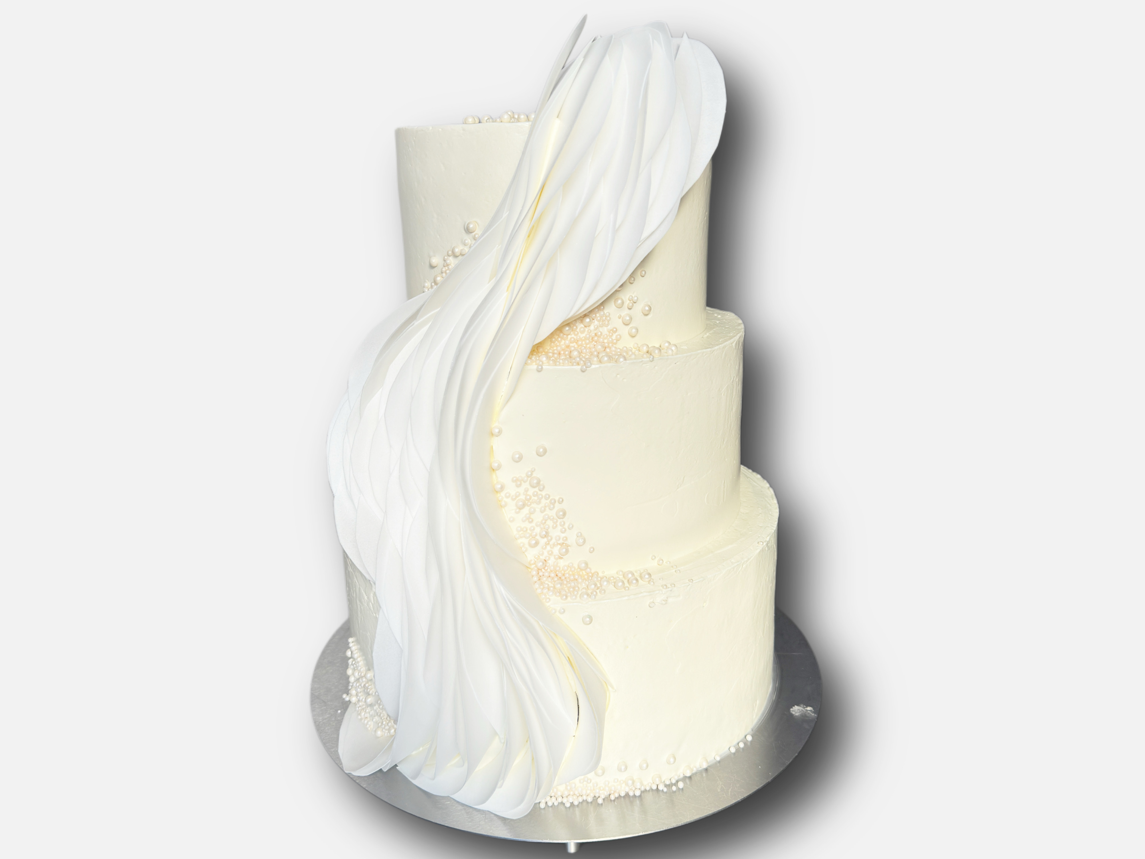 Tort w eleganckiej, śnieżnobiałej odsłonie, zachwycający minimalistycznym, a zarazem niezwykle przepięknym stylem. Całość ozdobiona jest subtelnymi perełkami, które tworzą efekt delikatnych kropli rosy. Najbardziej przyciąga uwagę imponująca dekoracja przypominająca zwiewne, białe skrzydło anioła spływające wzdłuż boków tortu. Ta unikalna kompozycja nadaje całości lekkości, czystości i wyjątkowego charakteru. Idealny wybór na wesele lub inne uroczystości, które wymagają nuty elegancji.