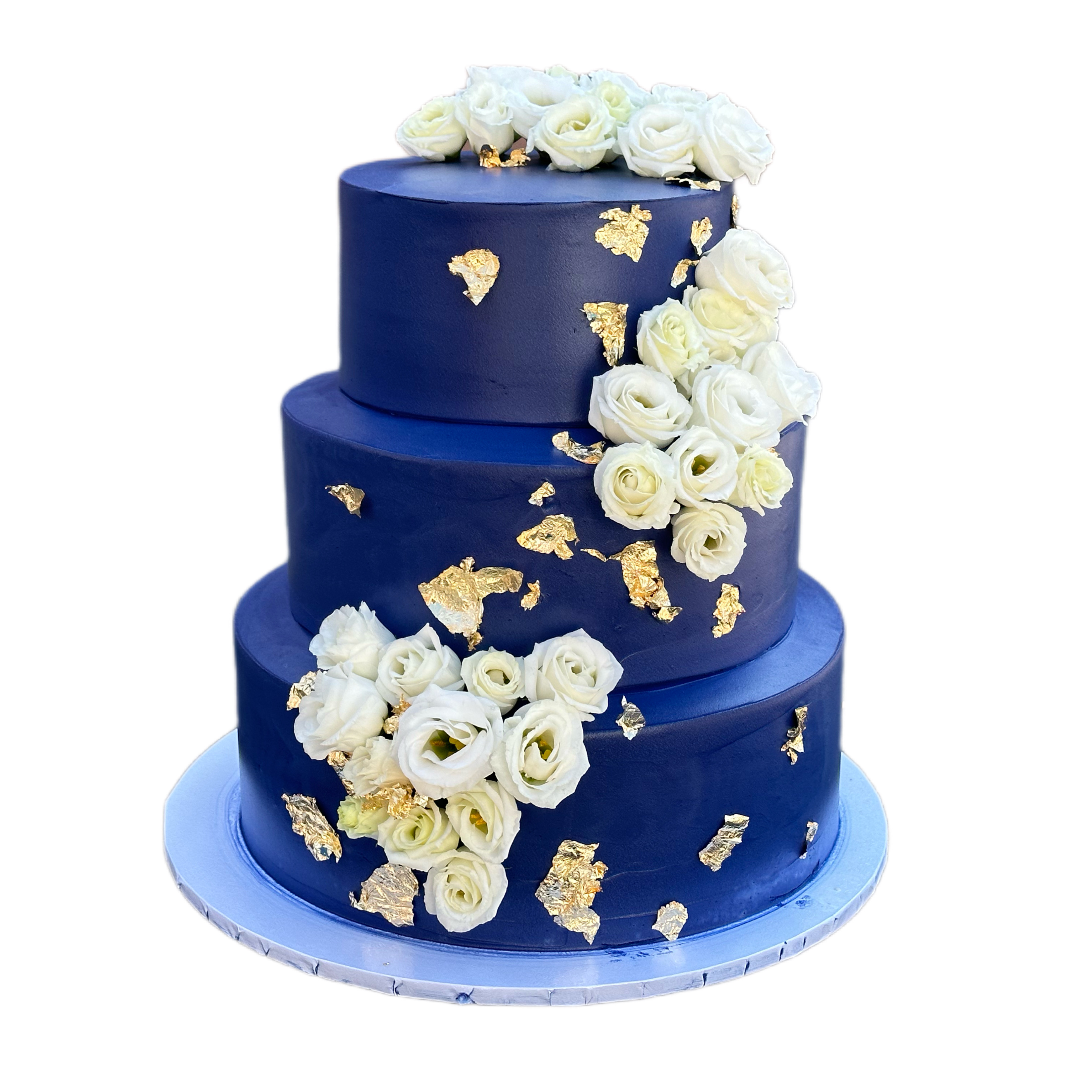 Piękny tort weselny w granatowym kolorze dekorowany białymi kwiatami i złotem jadalnym.