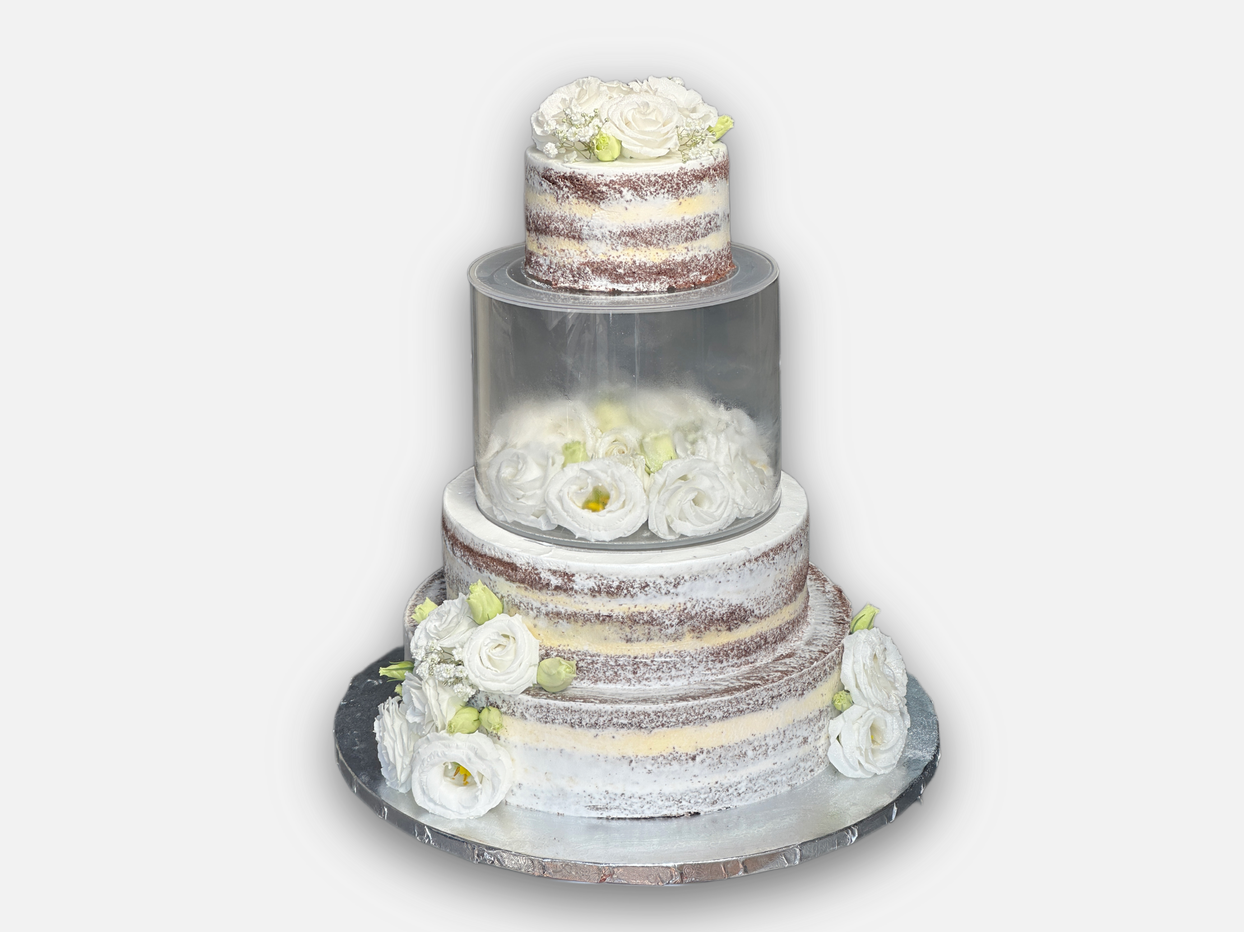 Tort weselny Naked cake z przeszklonym piętrem w którym umieszczone są świeże kwiaty.