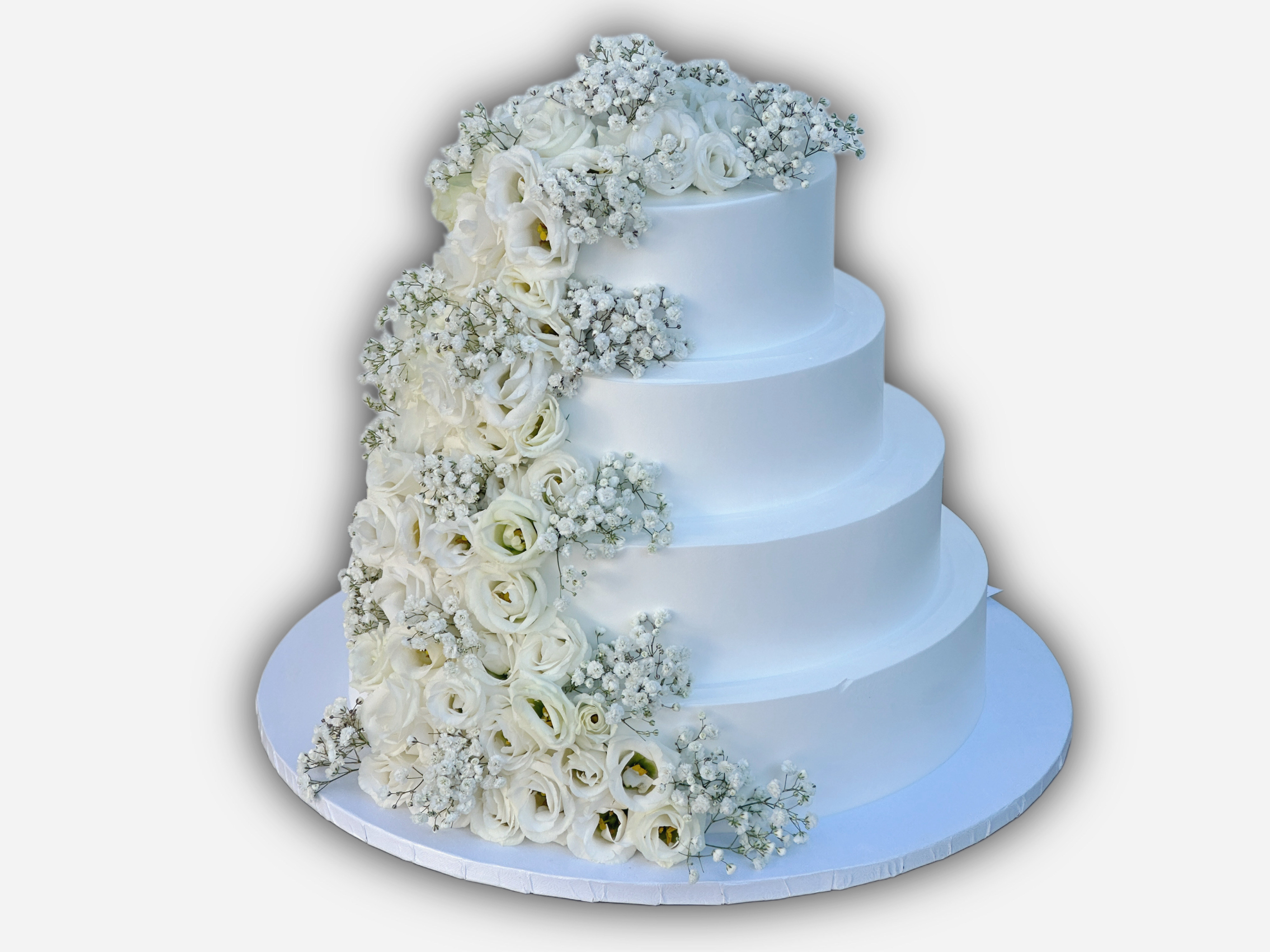Piękny tort weselny, dekorowany żywymi kwiatami.