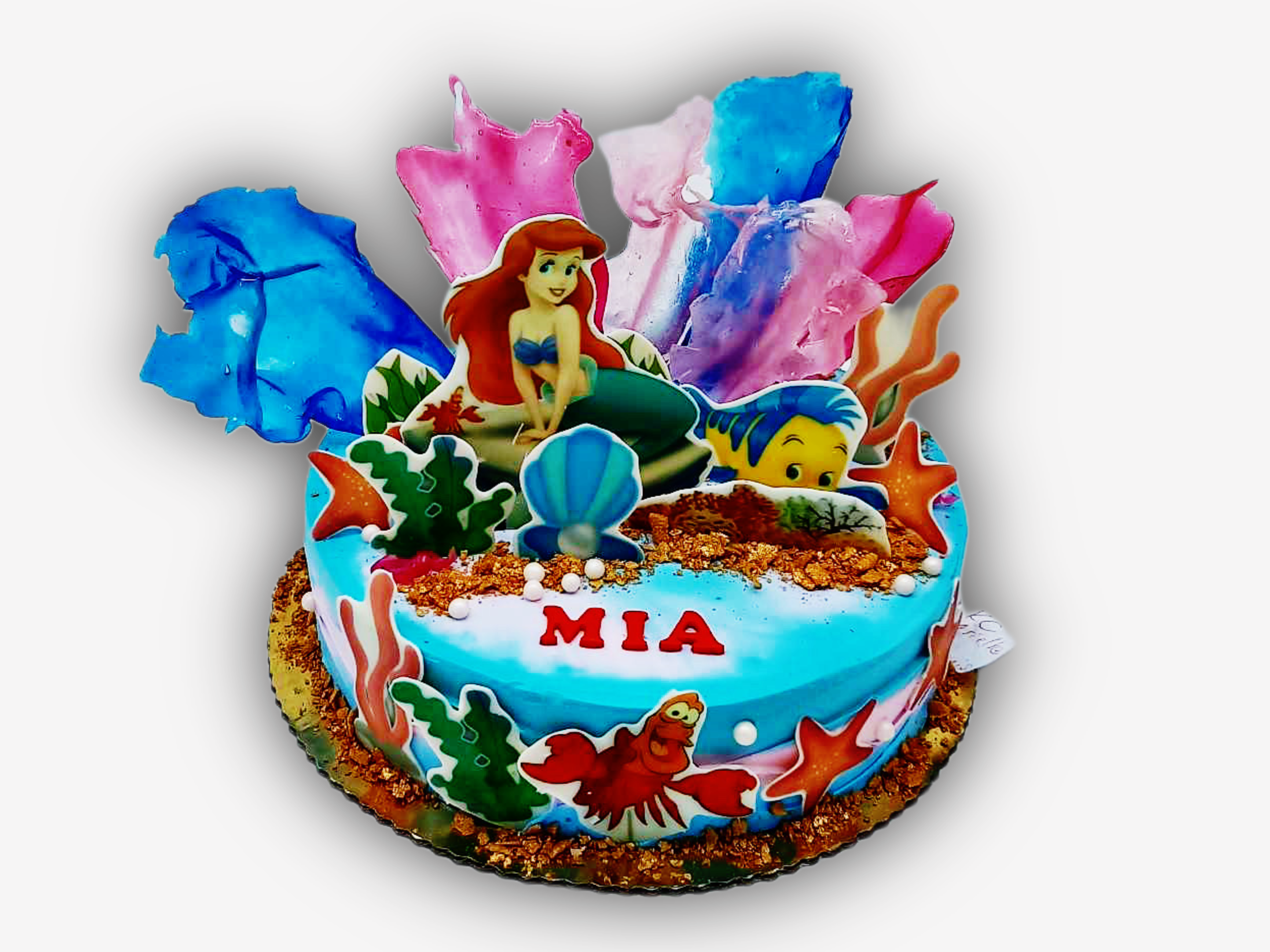 Tort dekorowany figurkami z bajki Arielki. Figurki wydrukowane na białej czekoladzie.