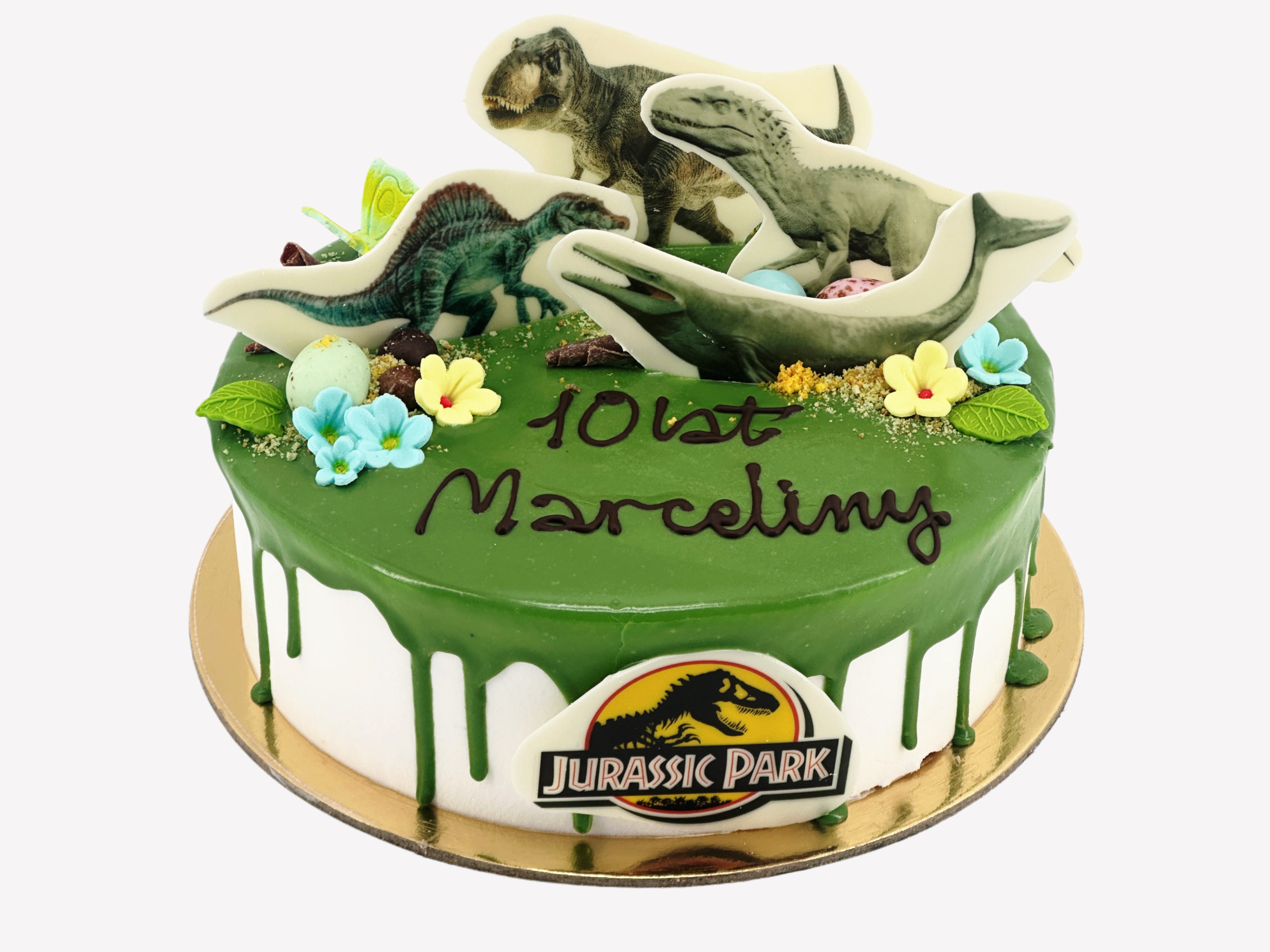 Tort dekorowany figurkami dinozaurów to świetny pomysł na przyjęcie urodzinowe , zwłaszcza dla miłośników prehistorii. Figurki wydrukowane na białej czekoladzie.