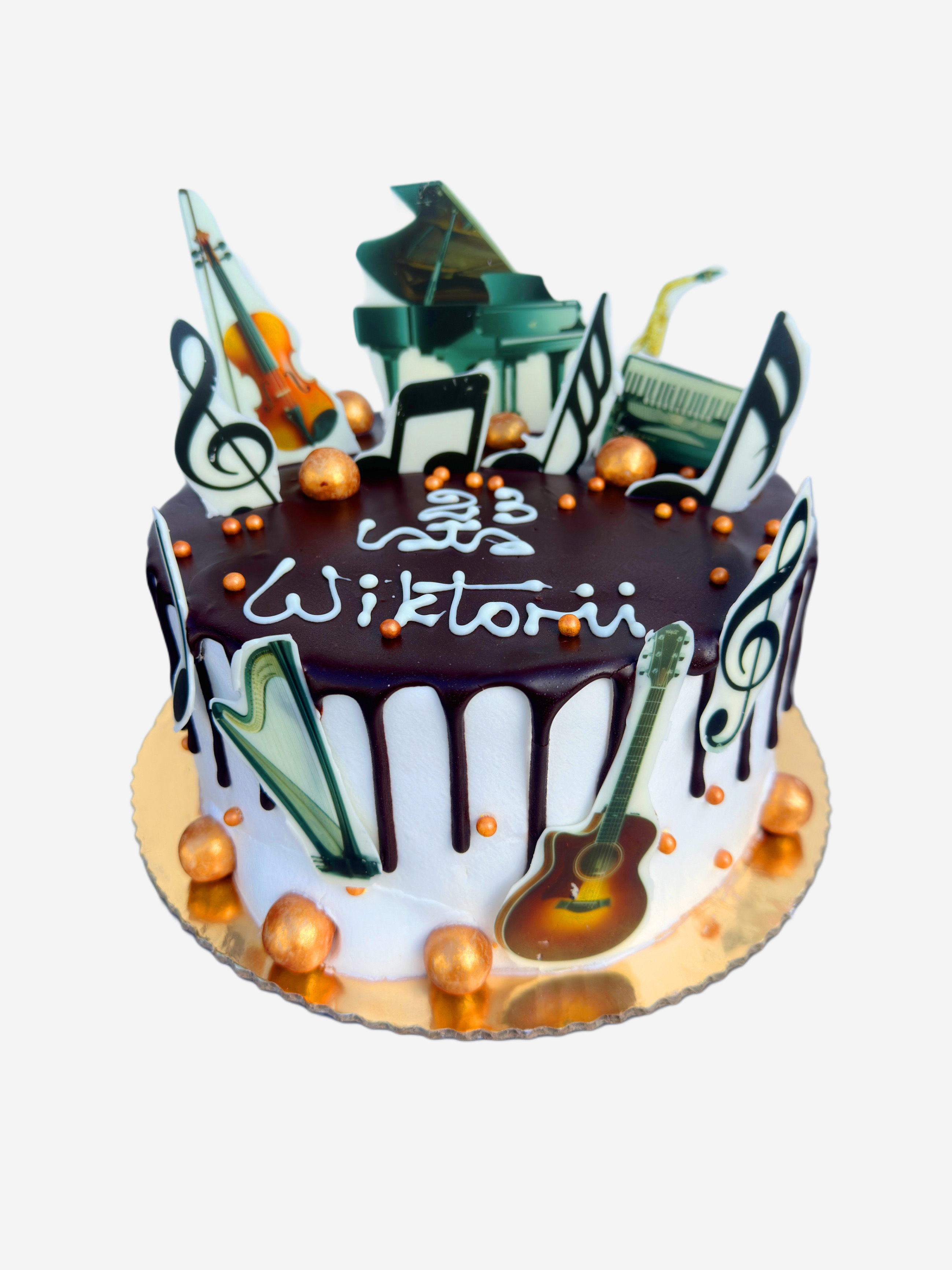 Tort dekorowany figurkami instrumentów, nutek. Figurki wydrukowane na białej czekoladzie.