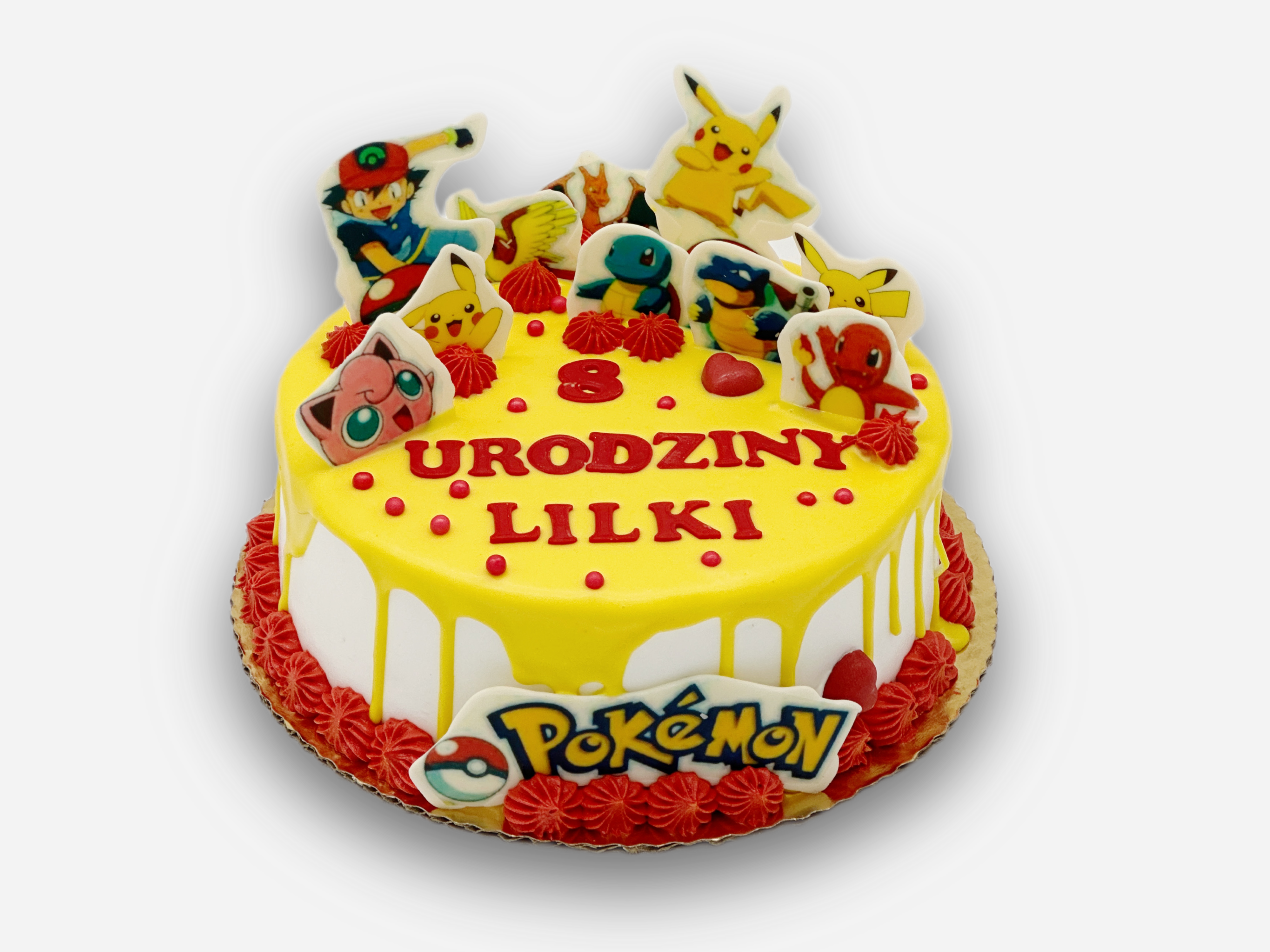 Tort dekorowany figurkami Pokemony. Figurki wydrukowane na białej czekoladzie.