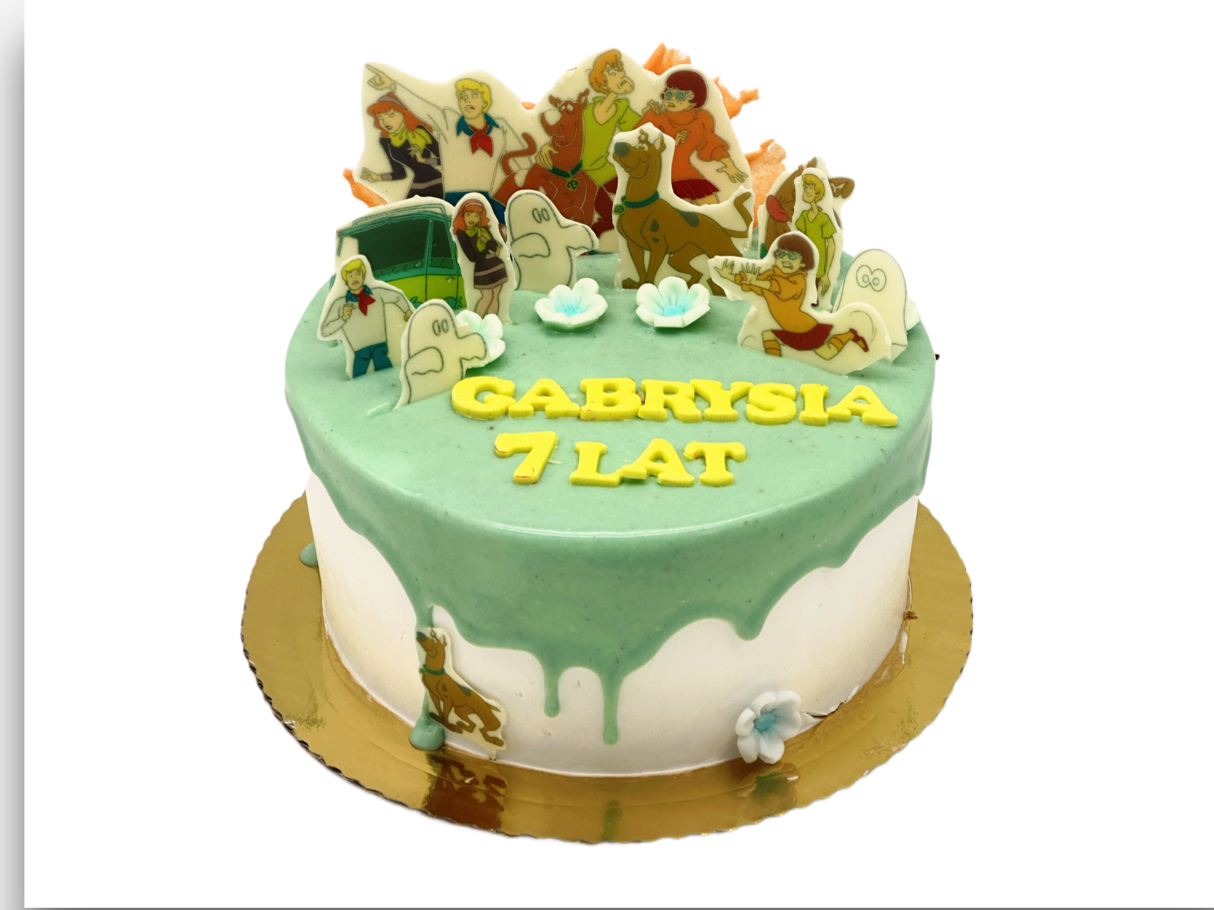Tort dekorowany figurkami z bajki Scooby Doo . Figurki wydrukowane na białej czekoladzie.