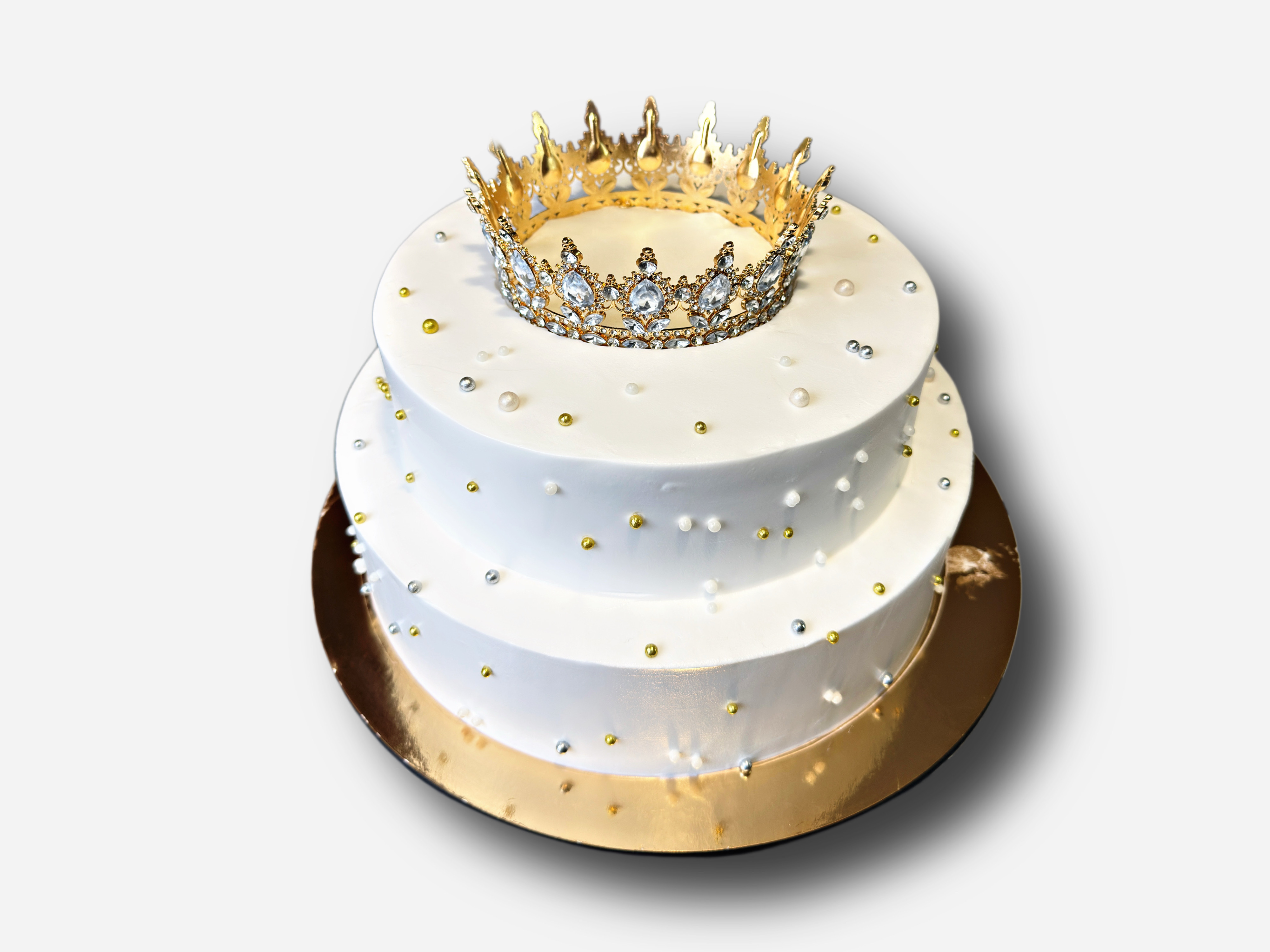 Tort Złota Korona to tort stworzony z myślą o wyjątkowych okazjach, gdzie liczy się elegancja, klasa i efekt "wow". Minimalistyczna, śnieżnobiała forma została przełamana królewskimi akcentami w odcieniach złota i srebra. Centralnym punktem dekoracji jest efektowna, złota korona podkreślająca luksusowy charakter wypieku. Całość prezentuje się niezwykle dostojnie, dzięki czemu tort sprawdzi się na przyjęciach księżniczek, wieczorach panieńskich itp. uroczystościach.