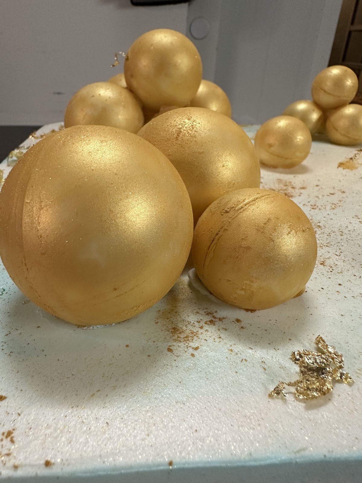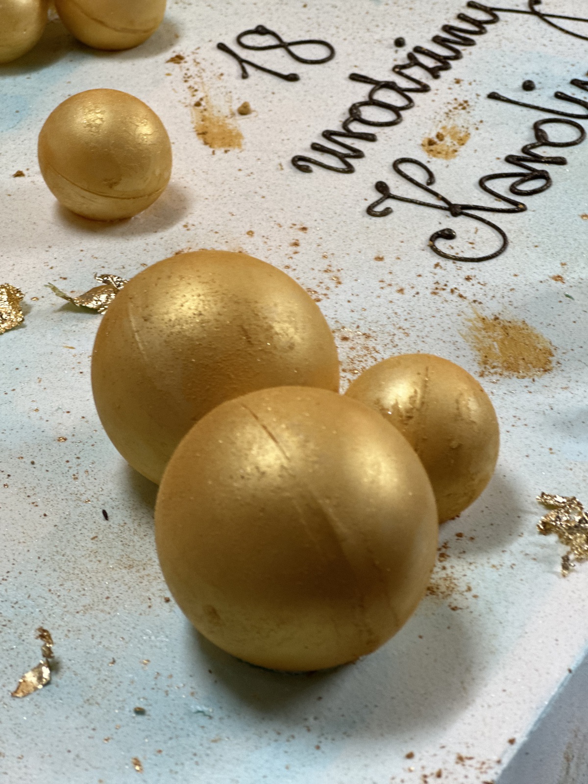 Tort dekorowany złotymi kulami z czekolady.