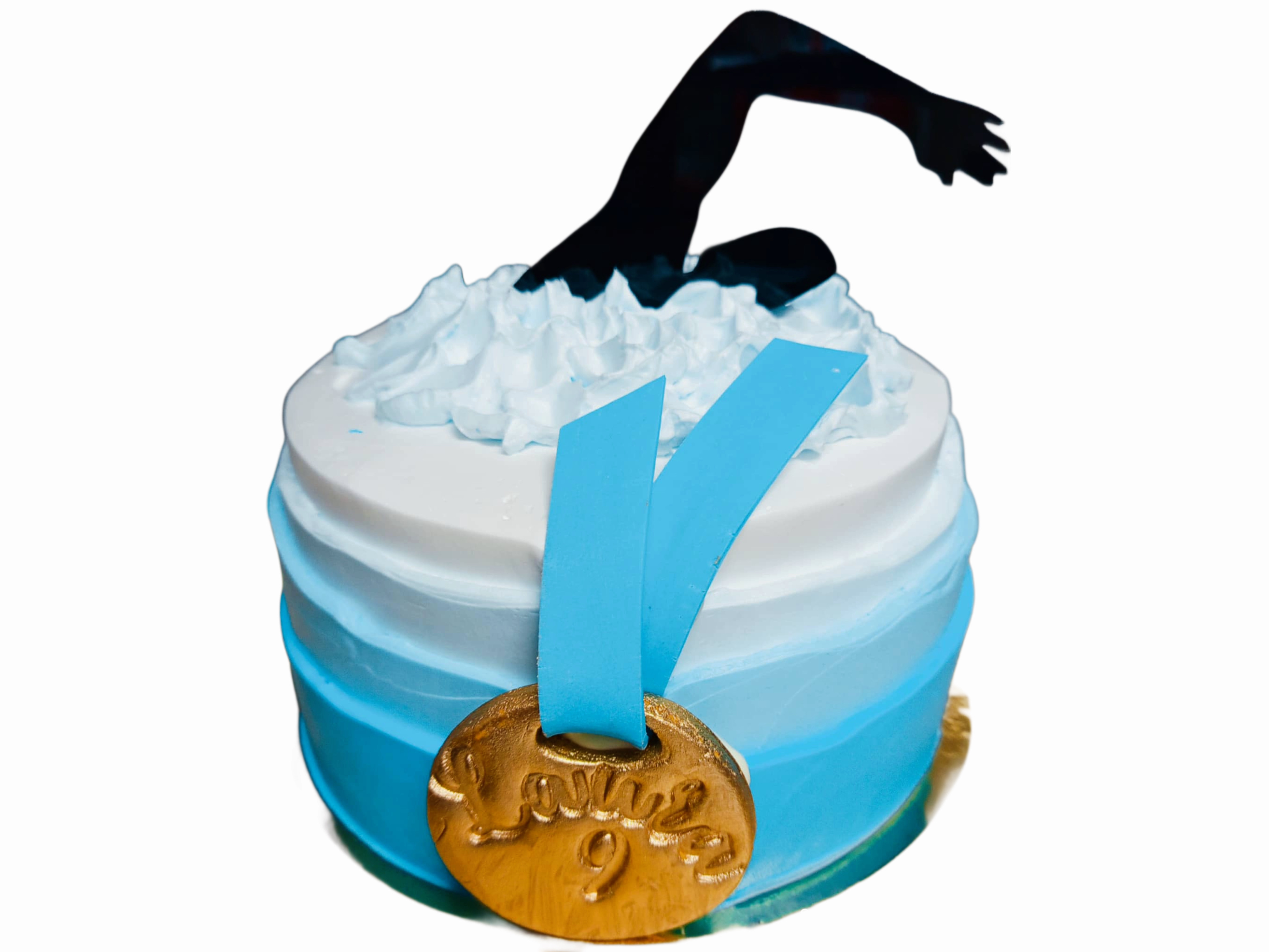 Tort tematyczny inspirowany pływaniem i sportową rywalizacją. Dekorowany w odcieniach błękitu z efektem przejścia kolorów, nawiązującym do wody. Góra tortu zdobi dynamiczna figurka pływaka w trakcie skoku, a całość uzupełnia ozdobny medal zawieszony na wstędze, podkreślający osiągnięcie i sukces. Idealny wybór na zawody sportowe, jubileusz, urodziny lub wyróżnienie młodego sportowca.