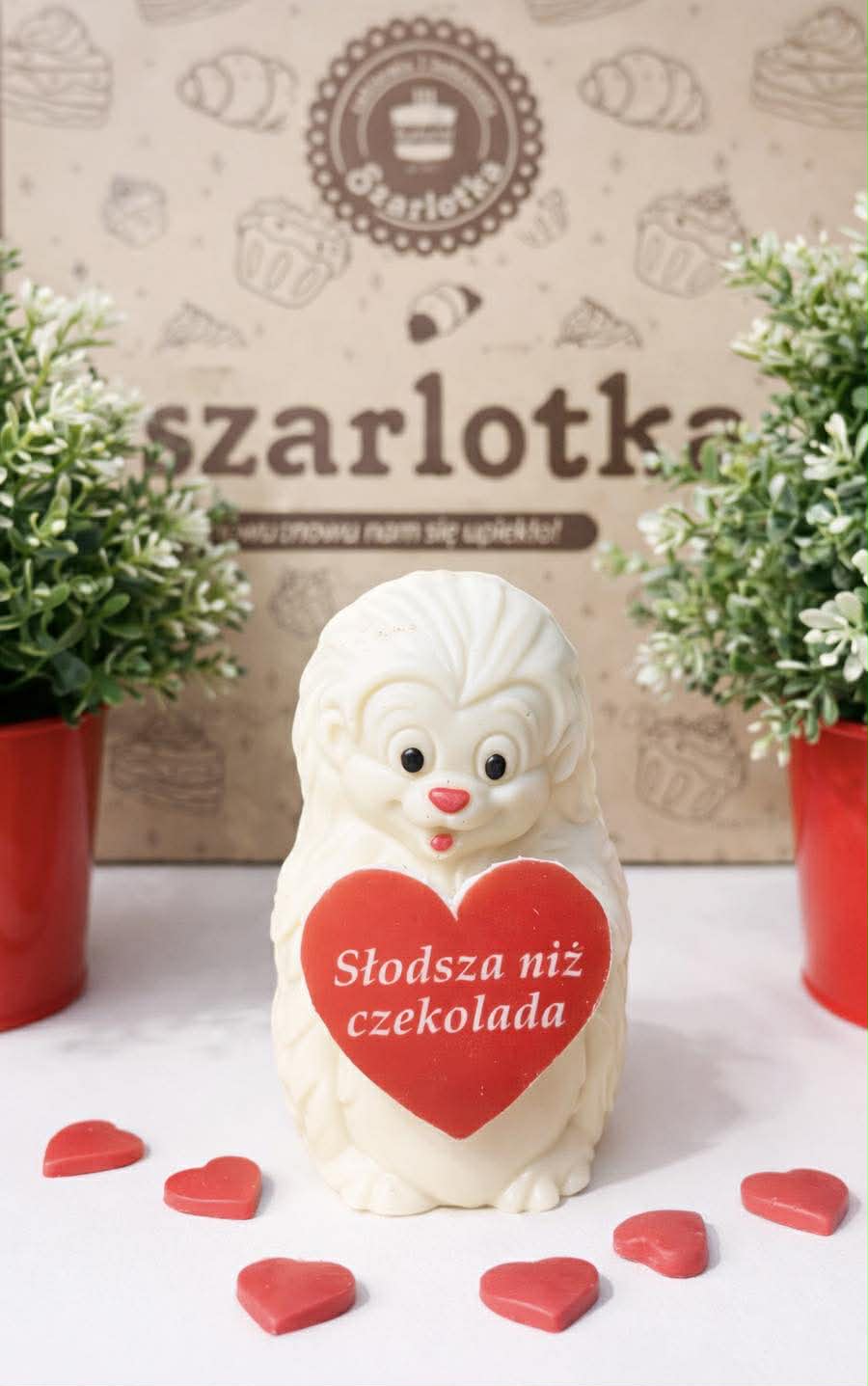 Słodki jak miłość od pierwszego kęsa! Czekoladowy Zgierzak z sercem i hasłem" Słodsza niż czekolada" idealny drobiazg na Walentynki .Figurka może być z białej lub ciemnej czekolady.